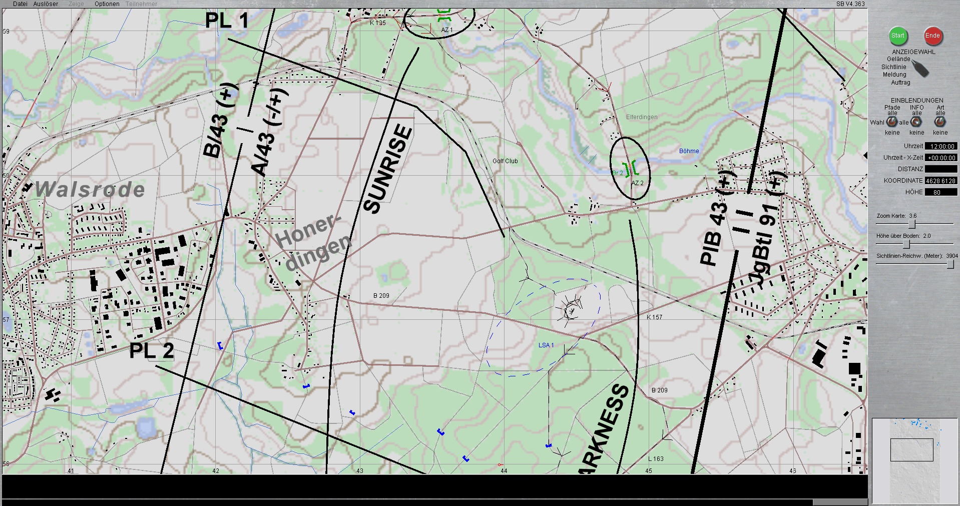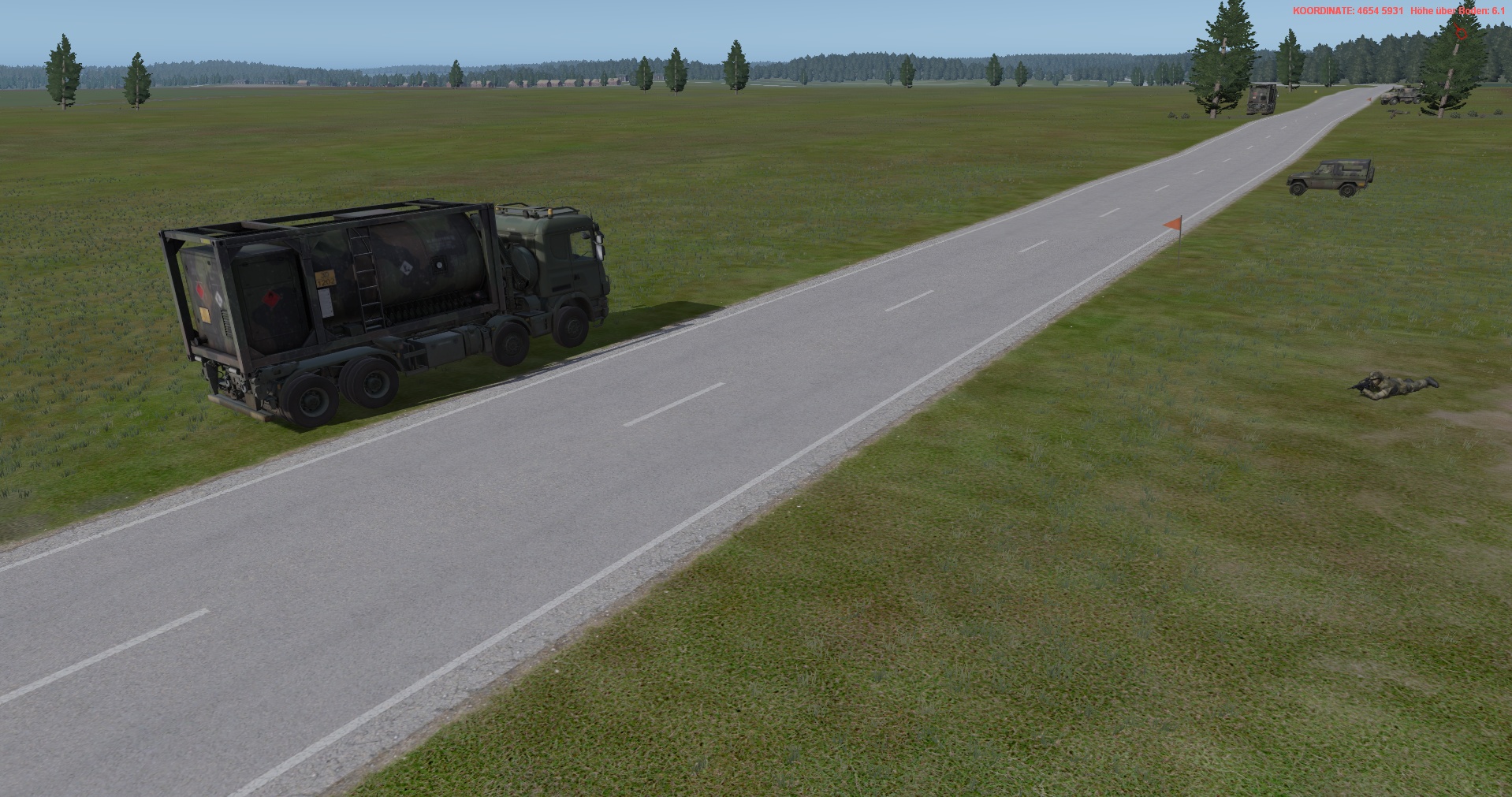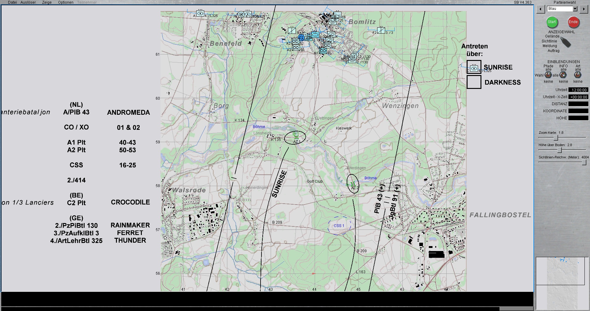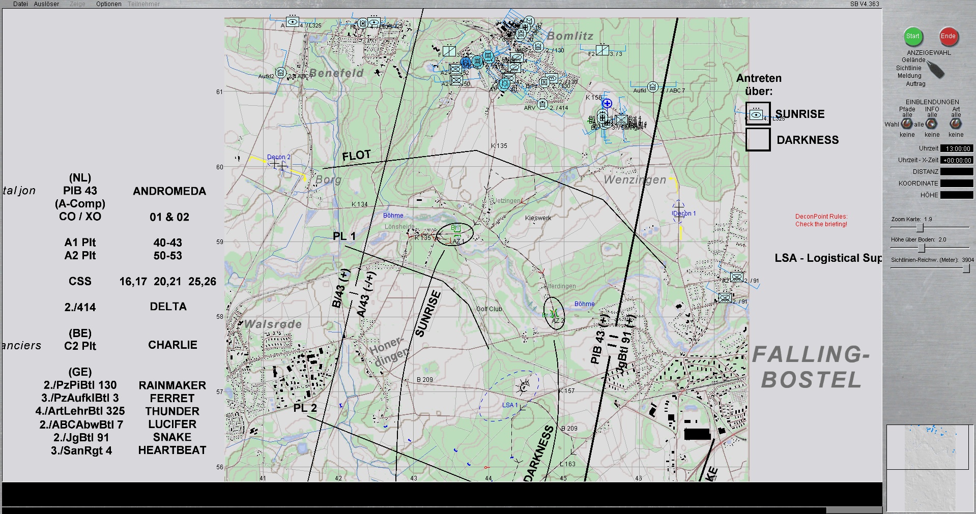 Der Panzerzug, vstk durch einen PzGrenHalbzug + den stv KpChef (02), werden der Kompanie voraus antreten. Sobald die Freifläche vor dem OBJ erreicht worden ist, geht die Kompanie in Sturmausgangsstellung und bereitet sich auf den Angriff auf das OBJ vor. Die Endstellungen im OBJ, sind für die jeweiligen Züge sind bereits eingetragen.