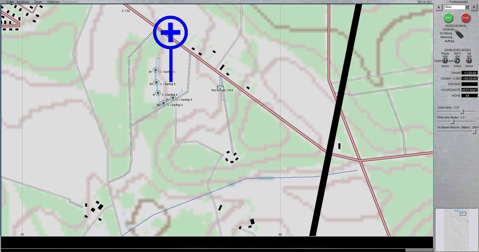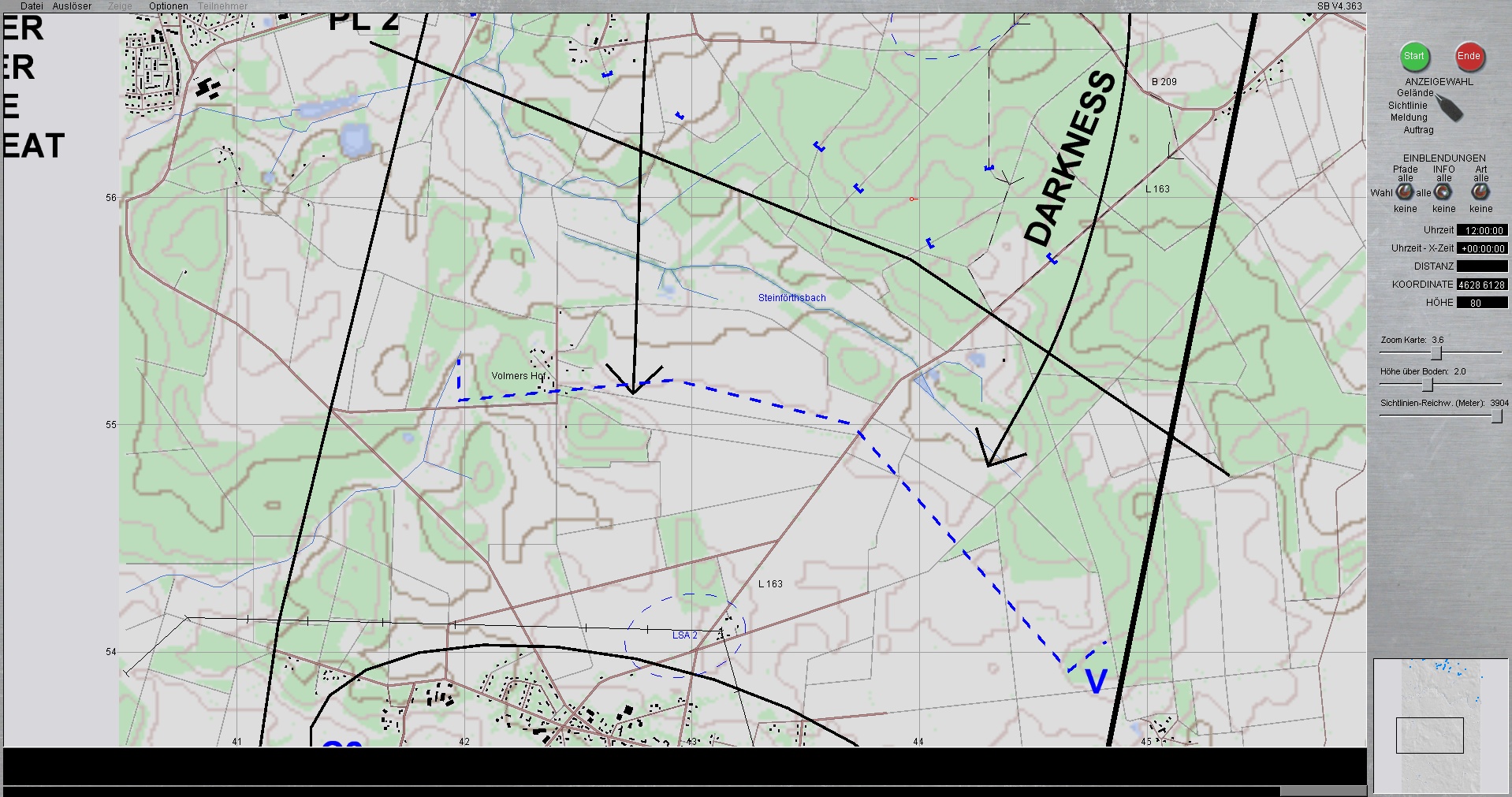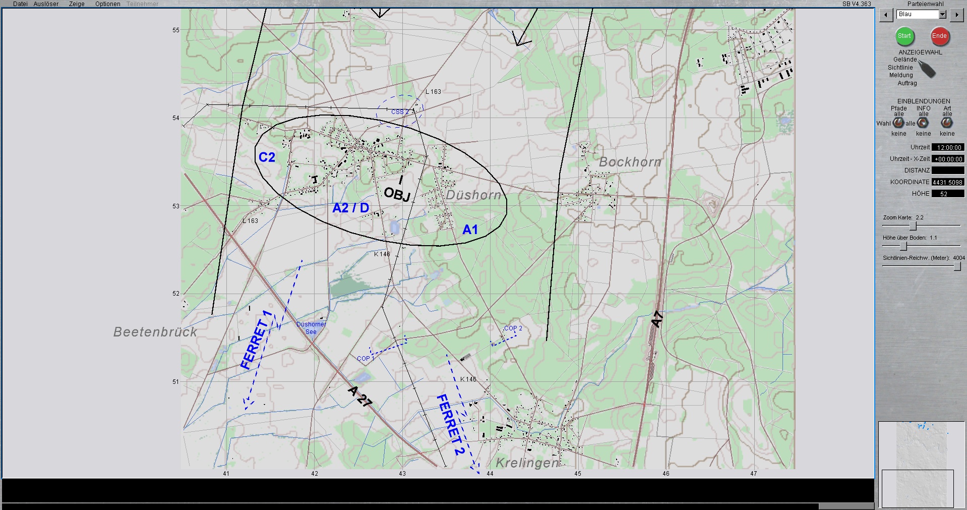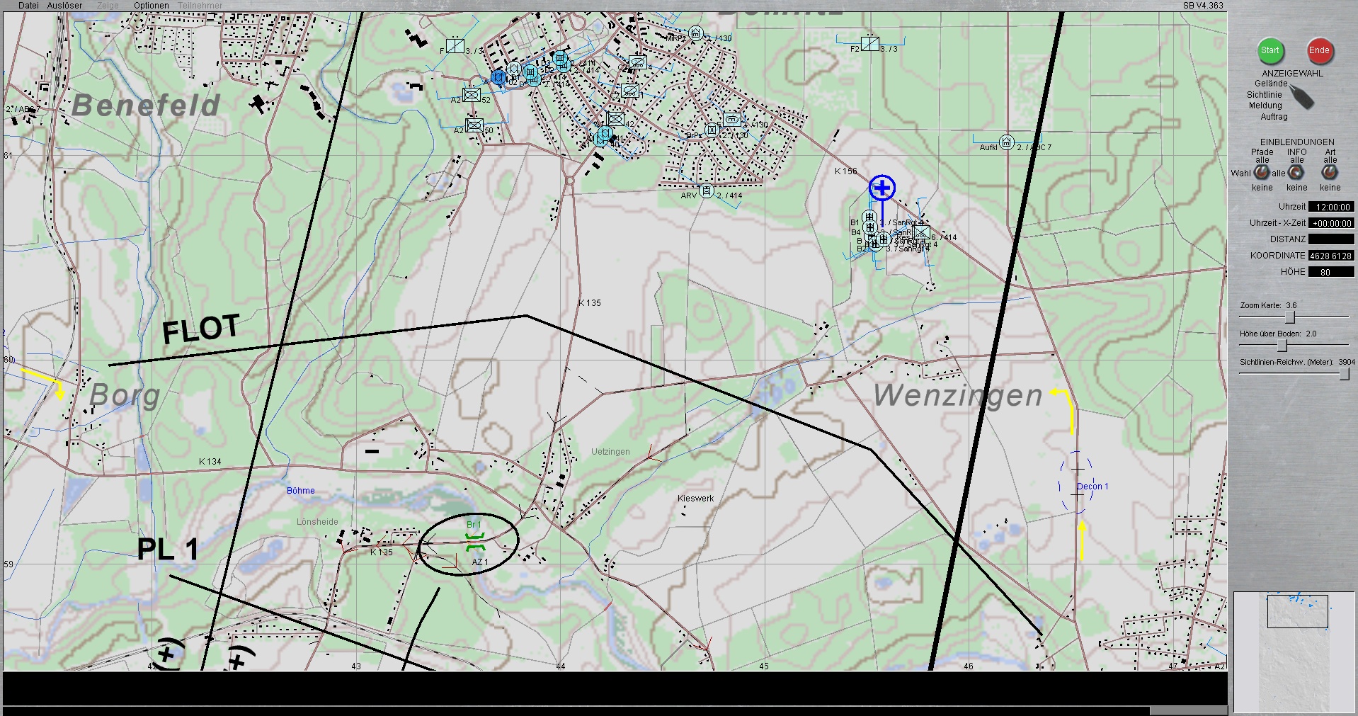 Der Panzerzug, vstk durch einen PzGrenHalbzug + den stv KpChef (02), werden der Kompanie voraus antreten. Sobald die Freifläche vor dem OBJ erreicht worden ist, geht die Kompanie in Sturmausgangsstellung und bereitet sich auf den Angriff auf das OBJ vor. Die Endstellungen im OBJ, sind für die jeweiligen Züge sind bereits eingetragen.