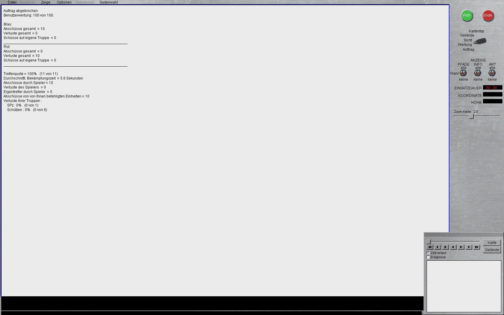 nur zur Info: Das Sce ist noch lange nicth fertig. Es fehlen Wertung, Strafzonen, Befehl, andere Karte soll eingesetzt werden und der Einstieg im Versammlungsraum muss anders organisiert werden (sonst können auf Seiten rot nur 3 Spieleer mit machen)....