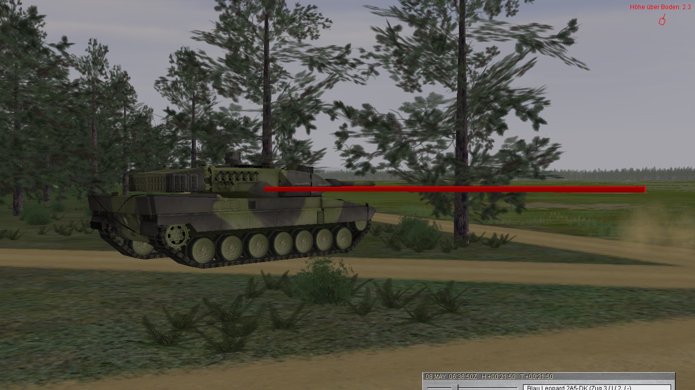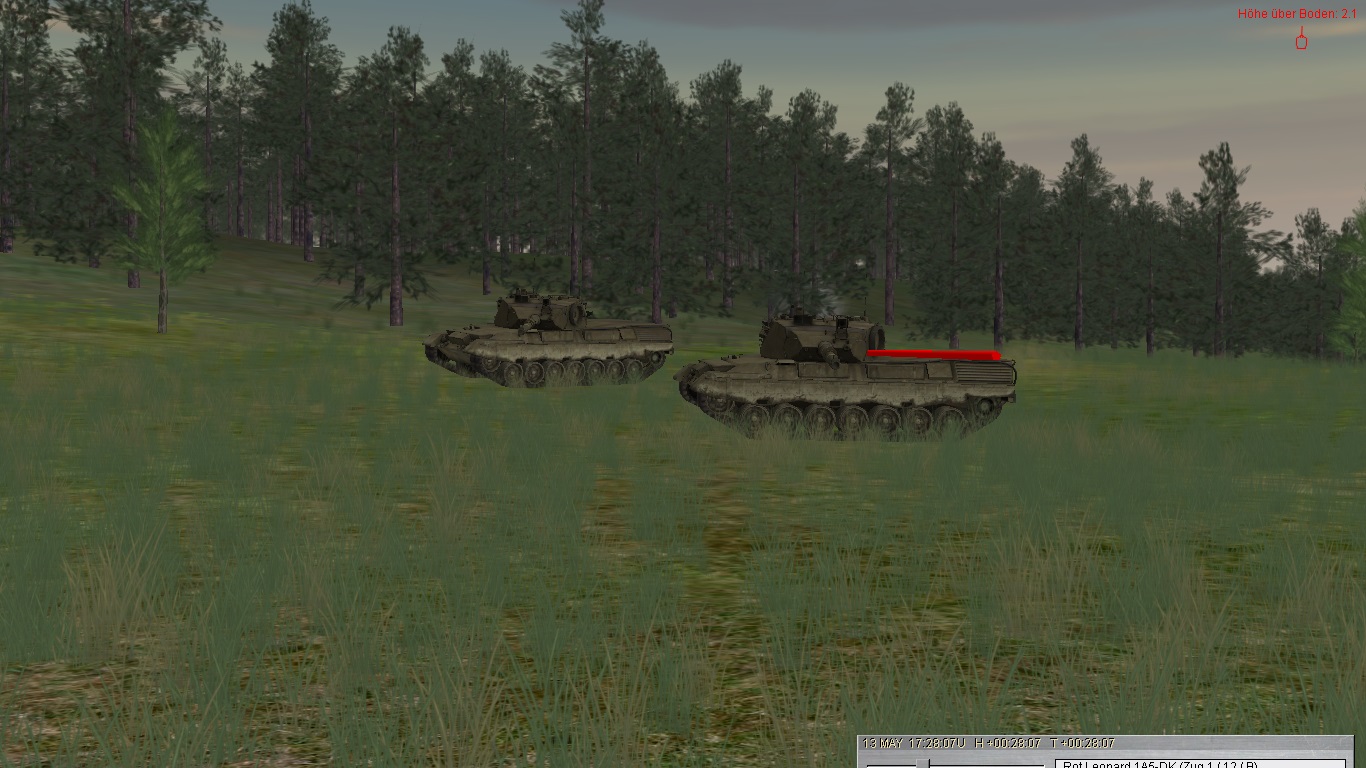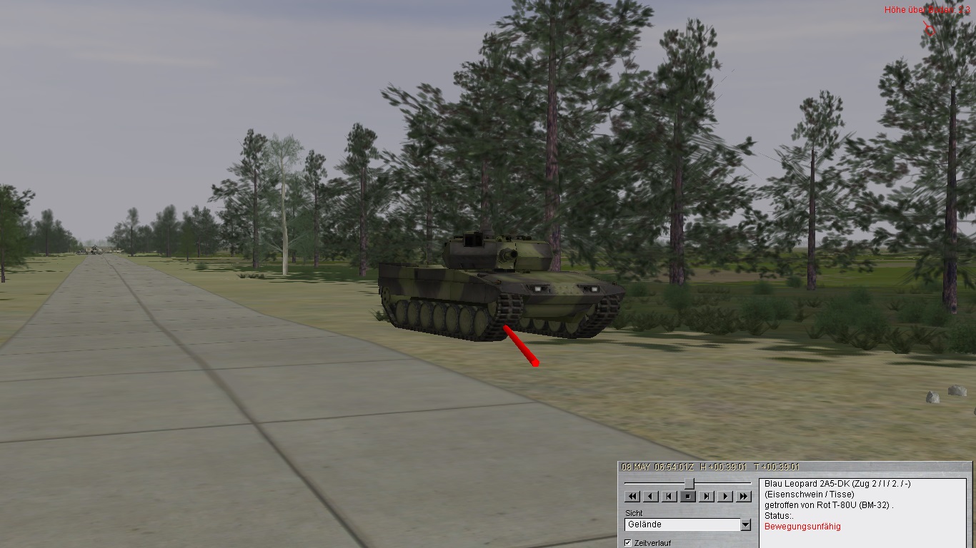 Alfa3 kassiert den ersten Treffer und muss sich kampfunfähig in GA retten (T80 aus ca. 2.500 Entfernung):Alfa2 stürmt weiter vor, kassiert aber später Kettentreffer und wird bewegungsunfähig: