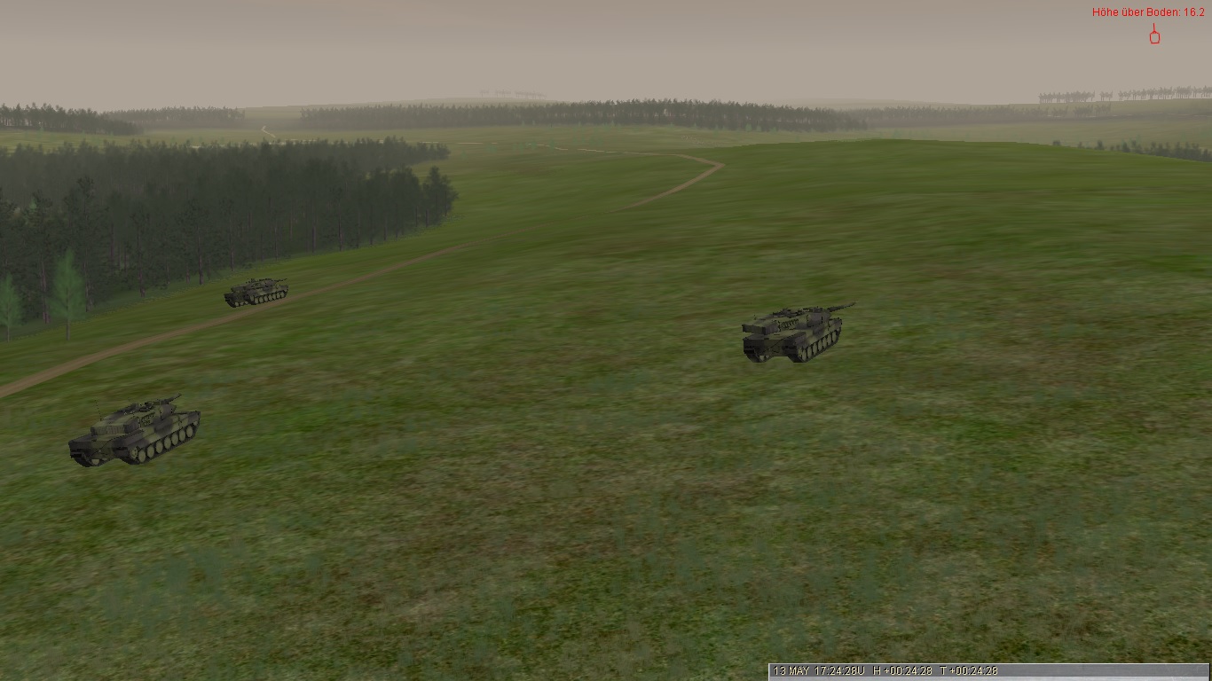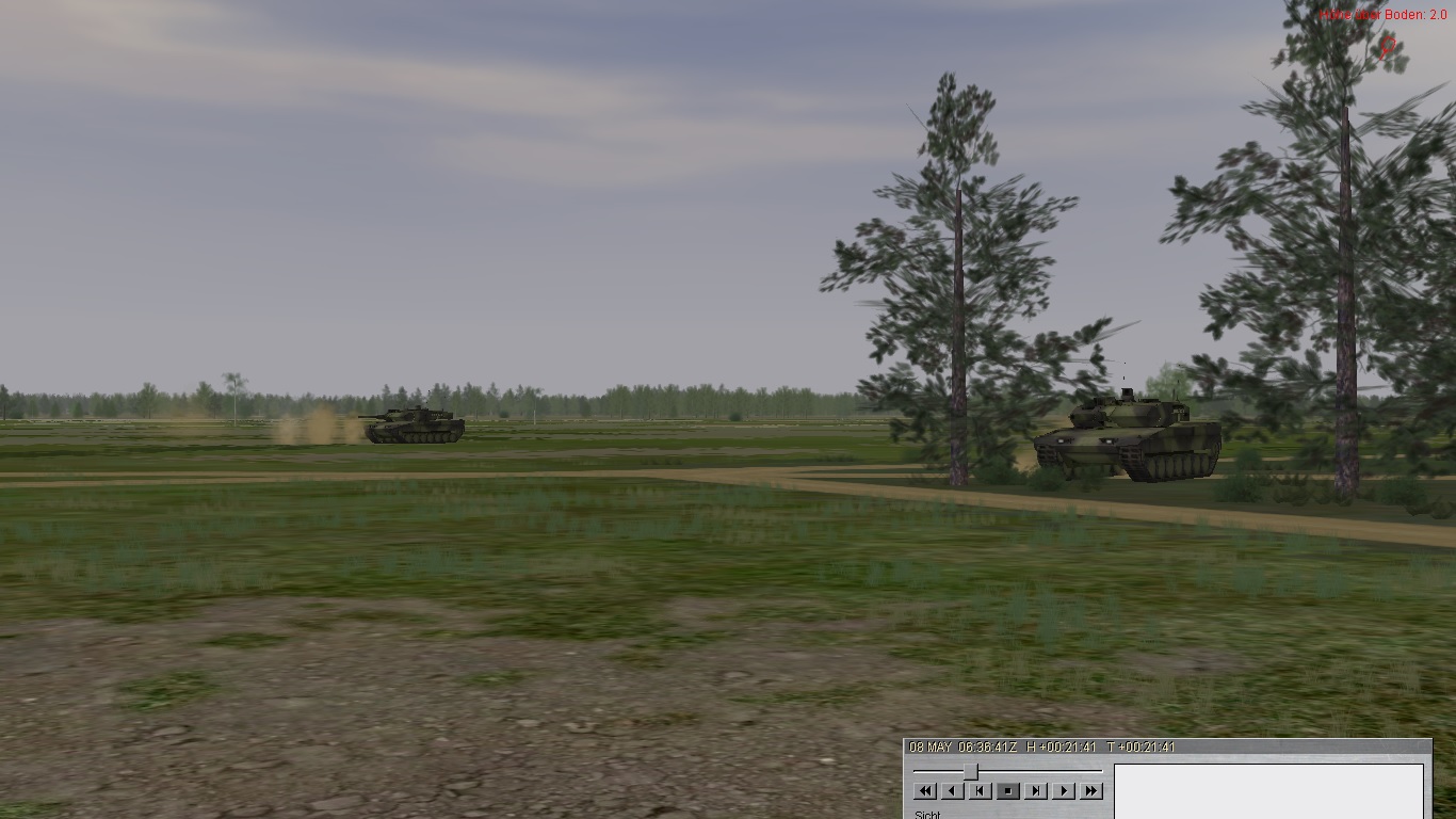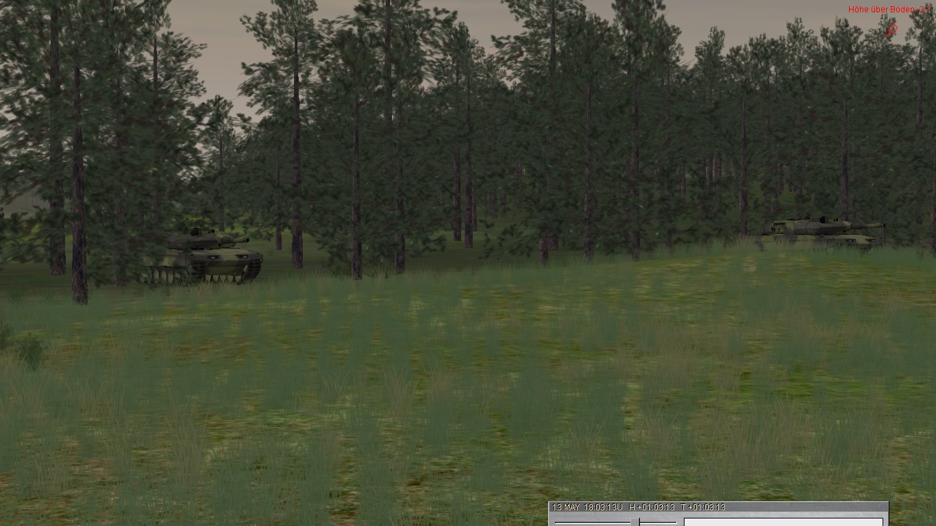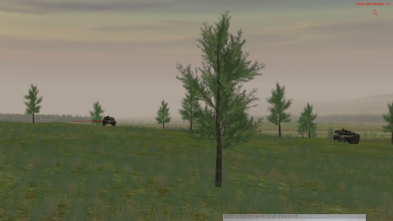 Alfa3 kassiert den ersten Treffer und muss sich kampfunfähig in GA retten (T80 aus ca. 2.500 Entfernung):Alfa2 stürmt weiter vor, kassiert aber später Kettentreffer und wird bewegungsunfähig: