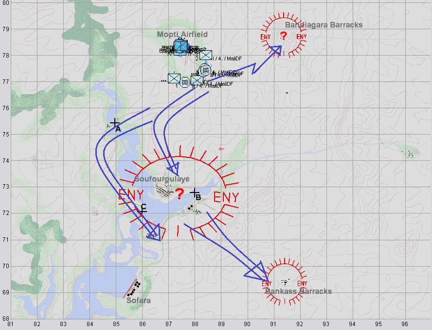 Task-Force-Scorpion führt Gefechtsaufklärung mit Kampfauftrag im Raum MOPTI-SOUFOUROULAYE-BANKASS durch, so dass:1. die Lage in den BANDIAGARA-BARRACKS festgestellt werden kann und INS die den Stützpunkt ggf. halten, geworfen werden,