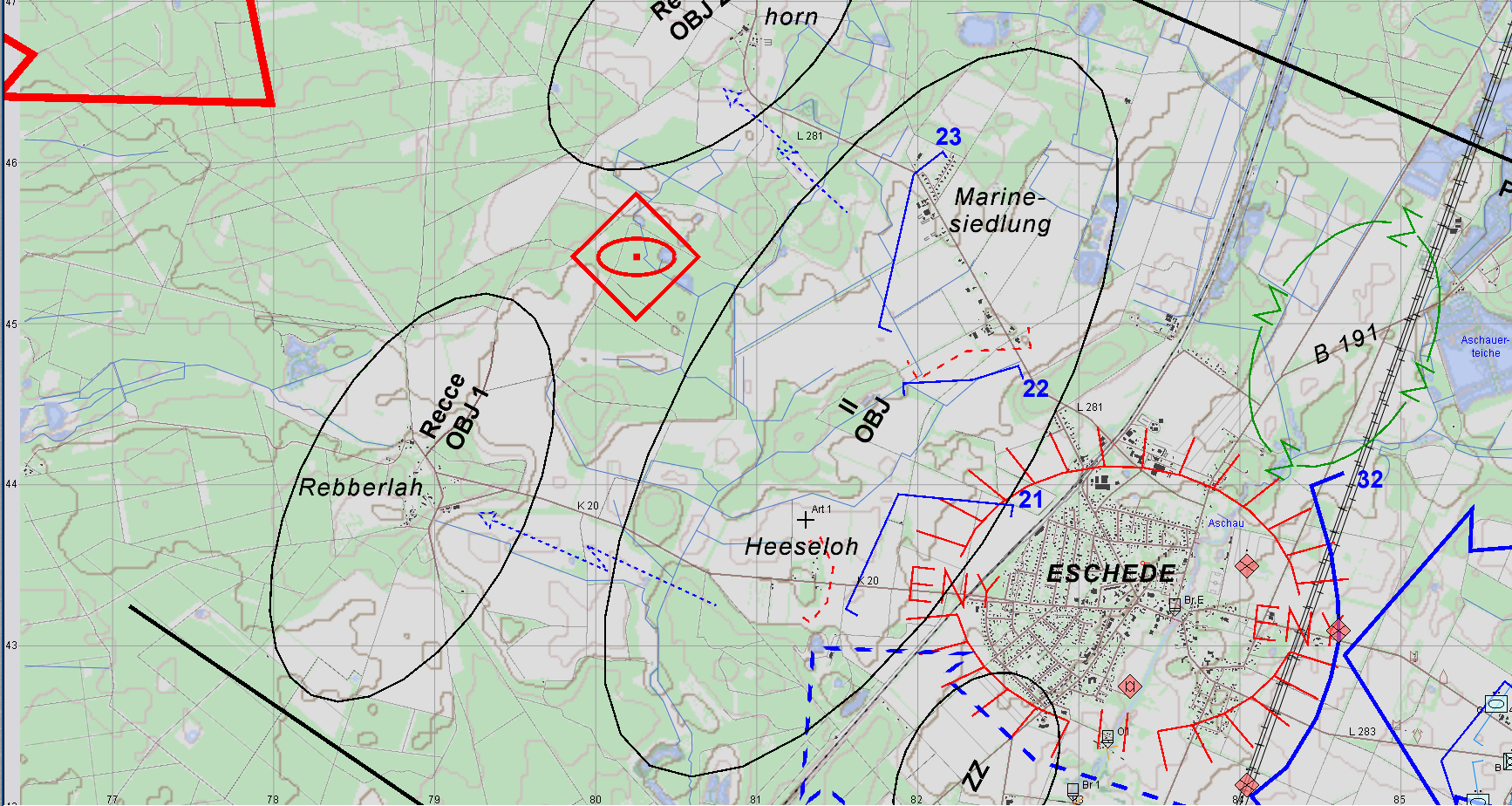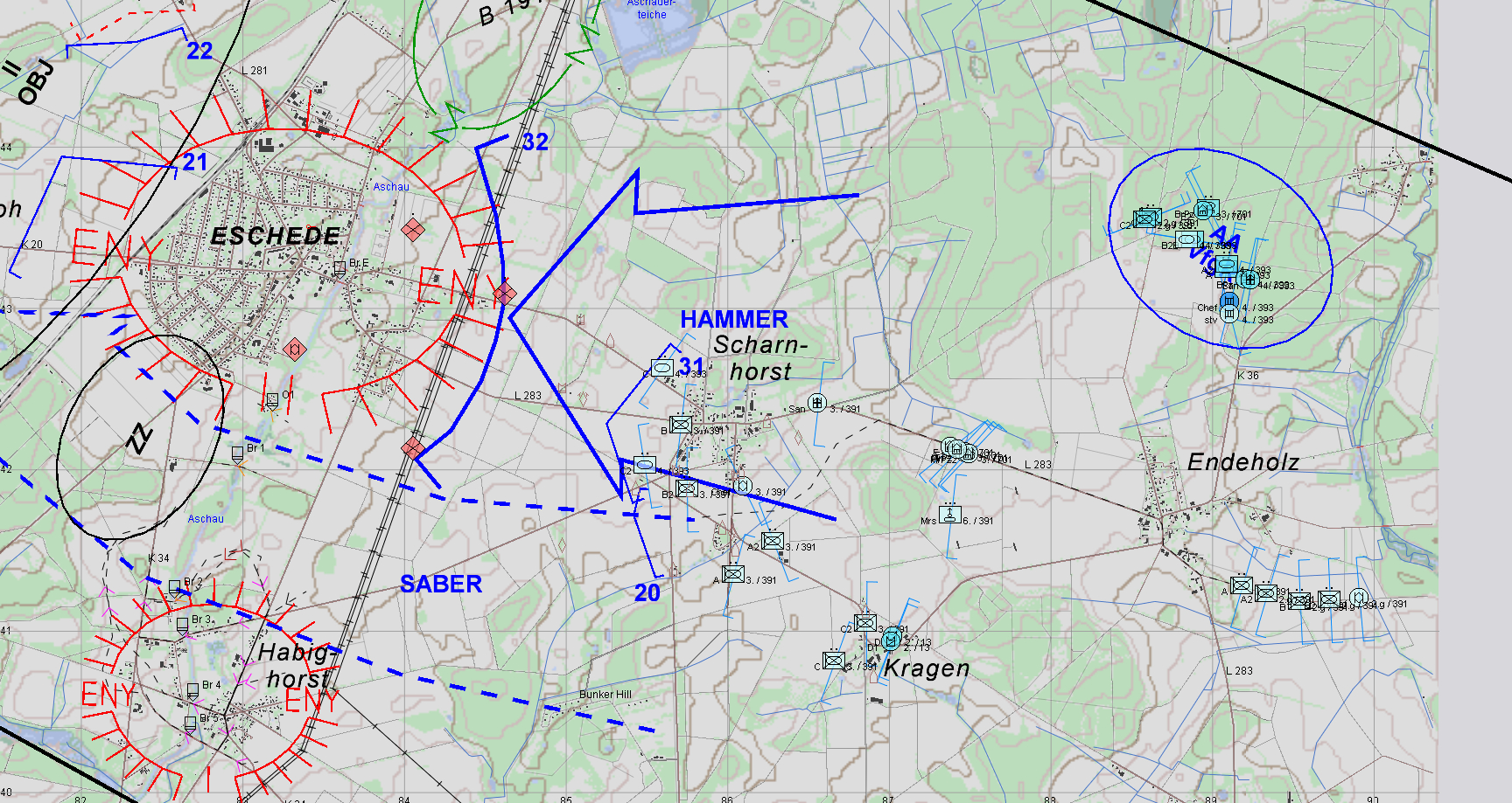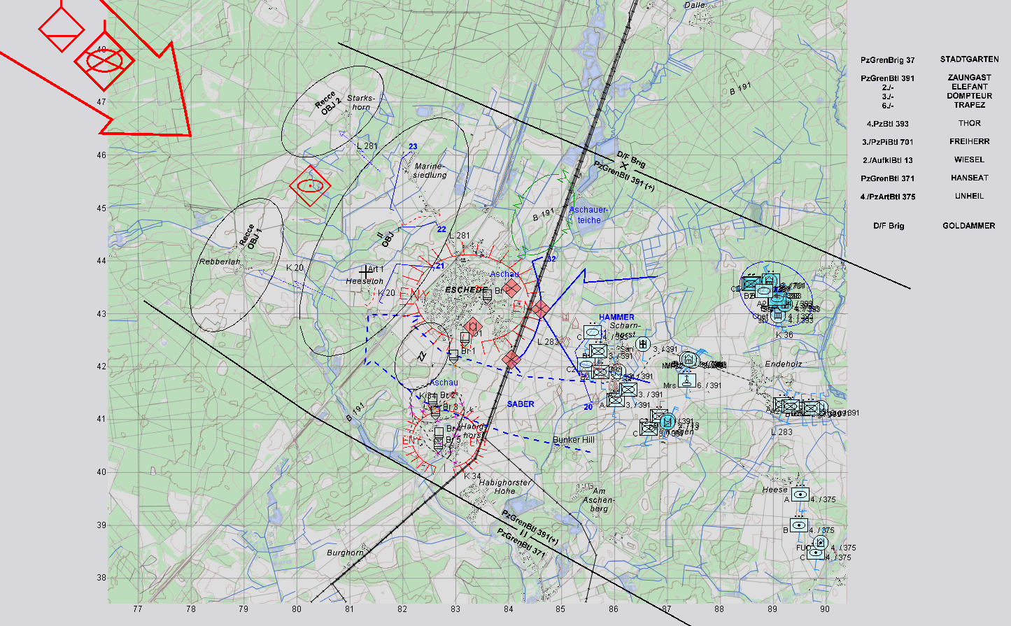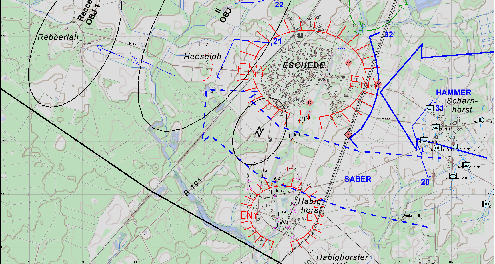 Unser Auftrag ist es, mit einer gemischen verm. PzKp einen Flankenstoß "SABER" südlich ESCHEDE durchzuführen und mit Unterstützung der PzGrenKp der 2./391 ESCHEDE einzukesseln, diese somit vom Nachschub abzuschneiden und somit zur Kapitulation zu zwingen.