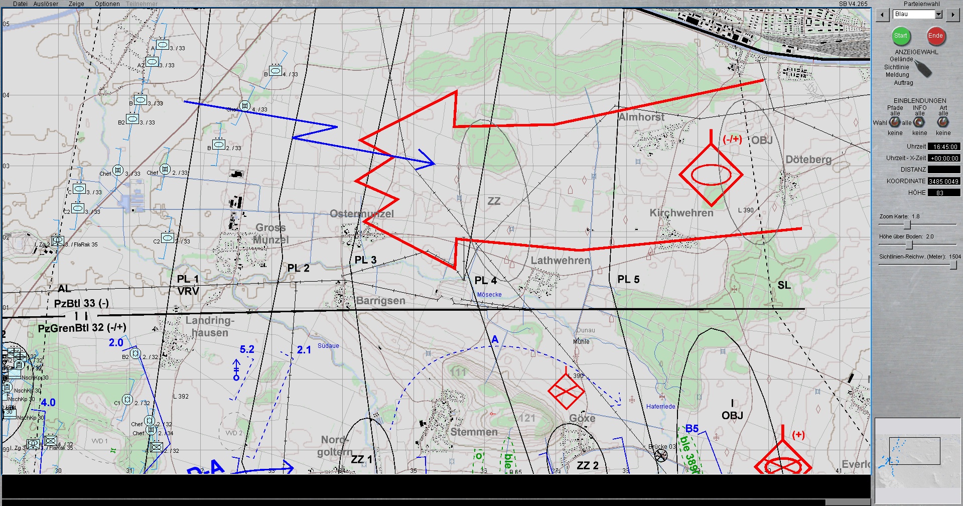 Nach dem letzten Angriff von ROT, hatte BLAU wieder hohe Verluste hinnehmen müssen und hatte bis zum VRV verzögert. Der fdl Angriff konnte dennoch erfolgreich abgewiesen werden. Fdl LL-Kräfte waren ostwärts GÖXE mit Transporthubschraubern gelandet und sichern jetzt womöglich den Raum um GÖXE, sowie die gesprengte Brücke 03.