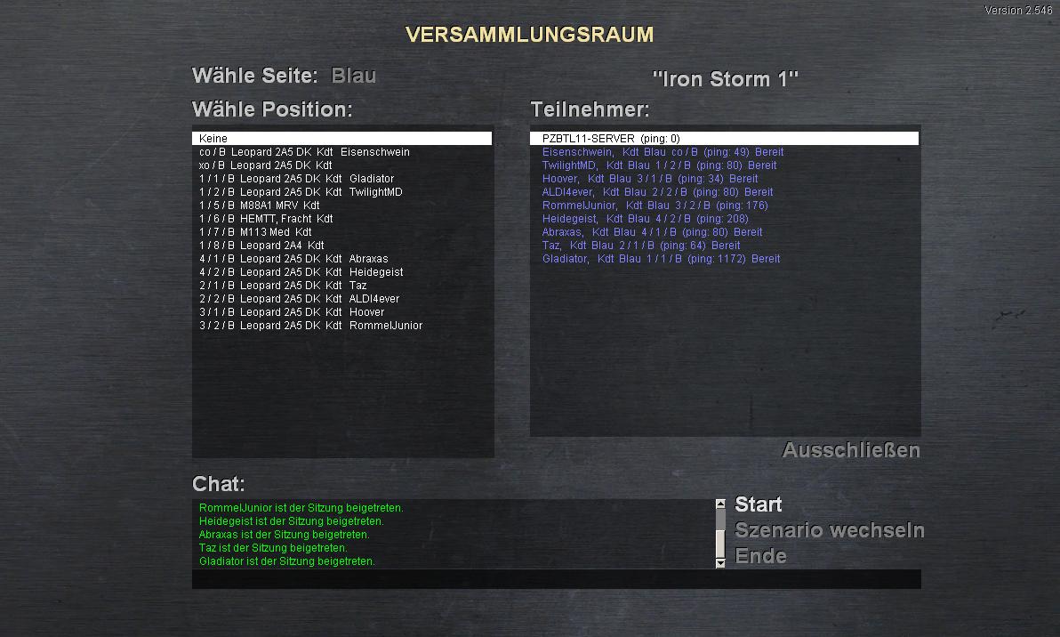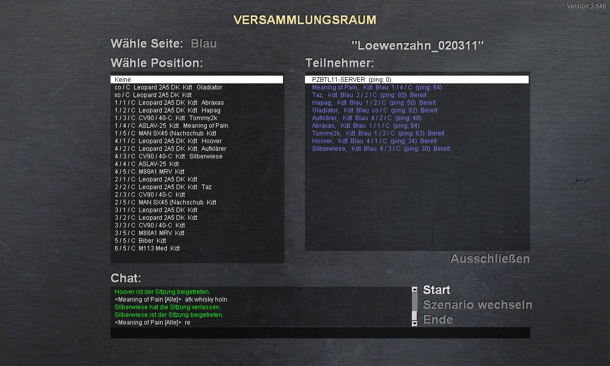 Rot: BMP-2, BRDM-2, (entweder eine Kompanie ->T80 o. T72M1 o. T72M4)Zeit: 90min