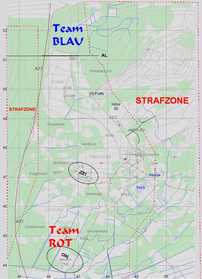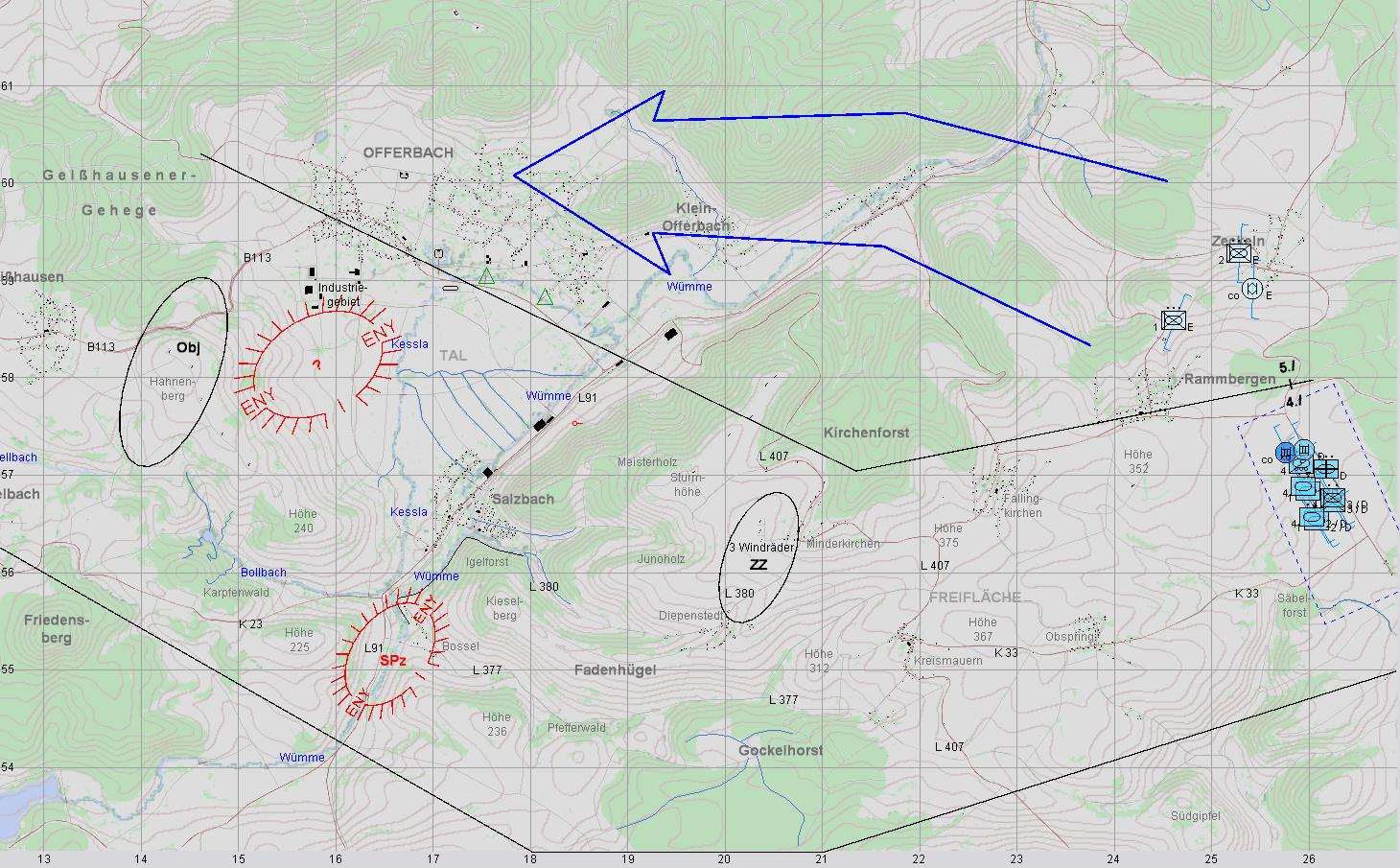 Auftrag: Bis nach Süden ins Objekt anzutreten, um das mögliche Antreten von Rot abwehren zu können.