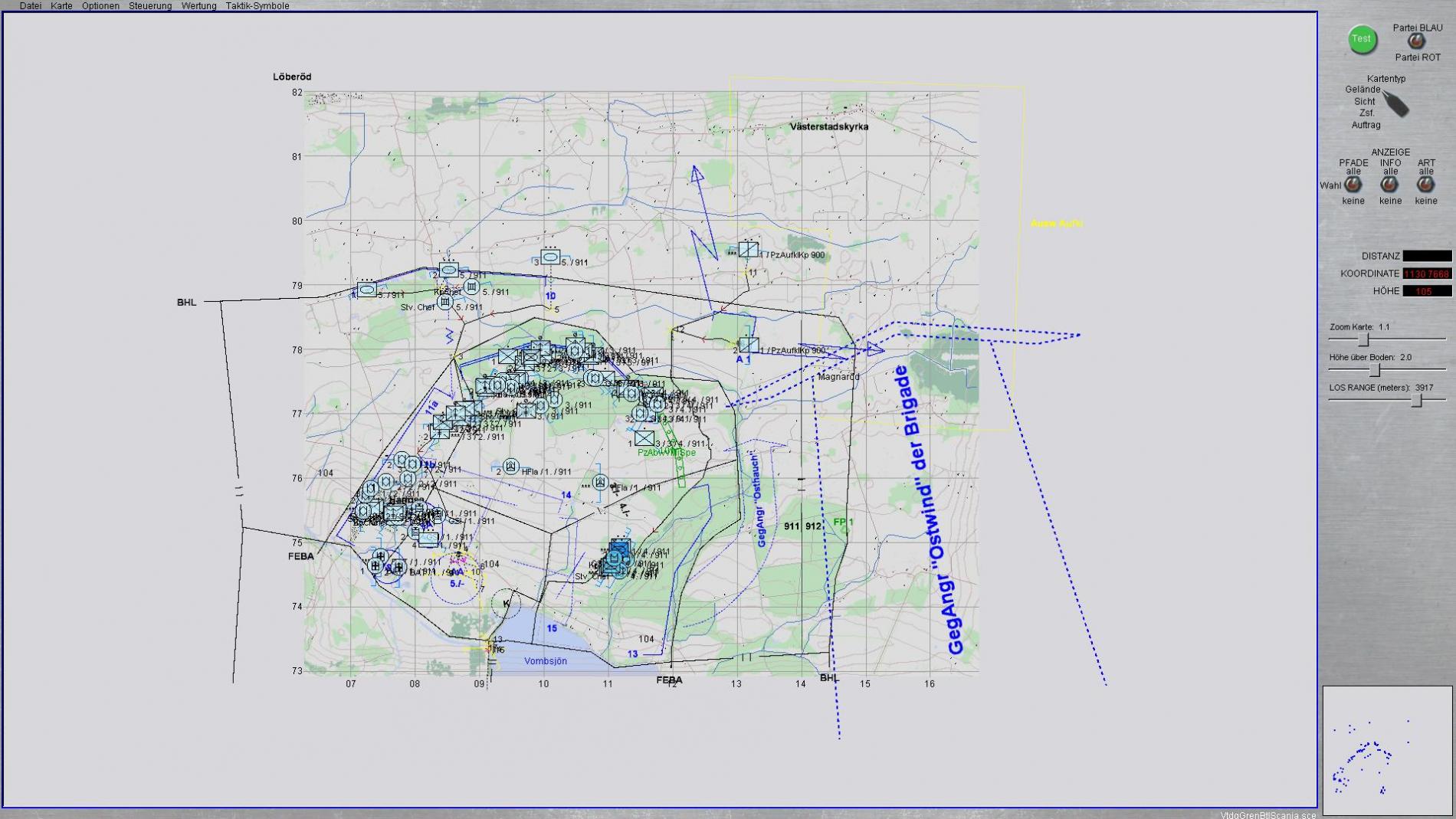 Der feindliche Kräfteansatz bleibt in jeder Variante gleich. An sich gibt es aber 4 verschiedene Varianten, die sich durch den Einsatz der Btl.-Reserve unterscheiden, und je nach Lage Blau ausgelöst werden, das heißt Schwachpunkte in der Verteidigung werden genutzt oder auch nicht.