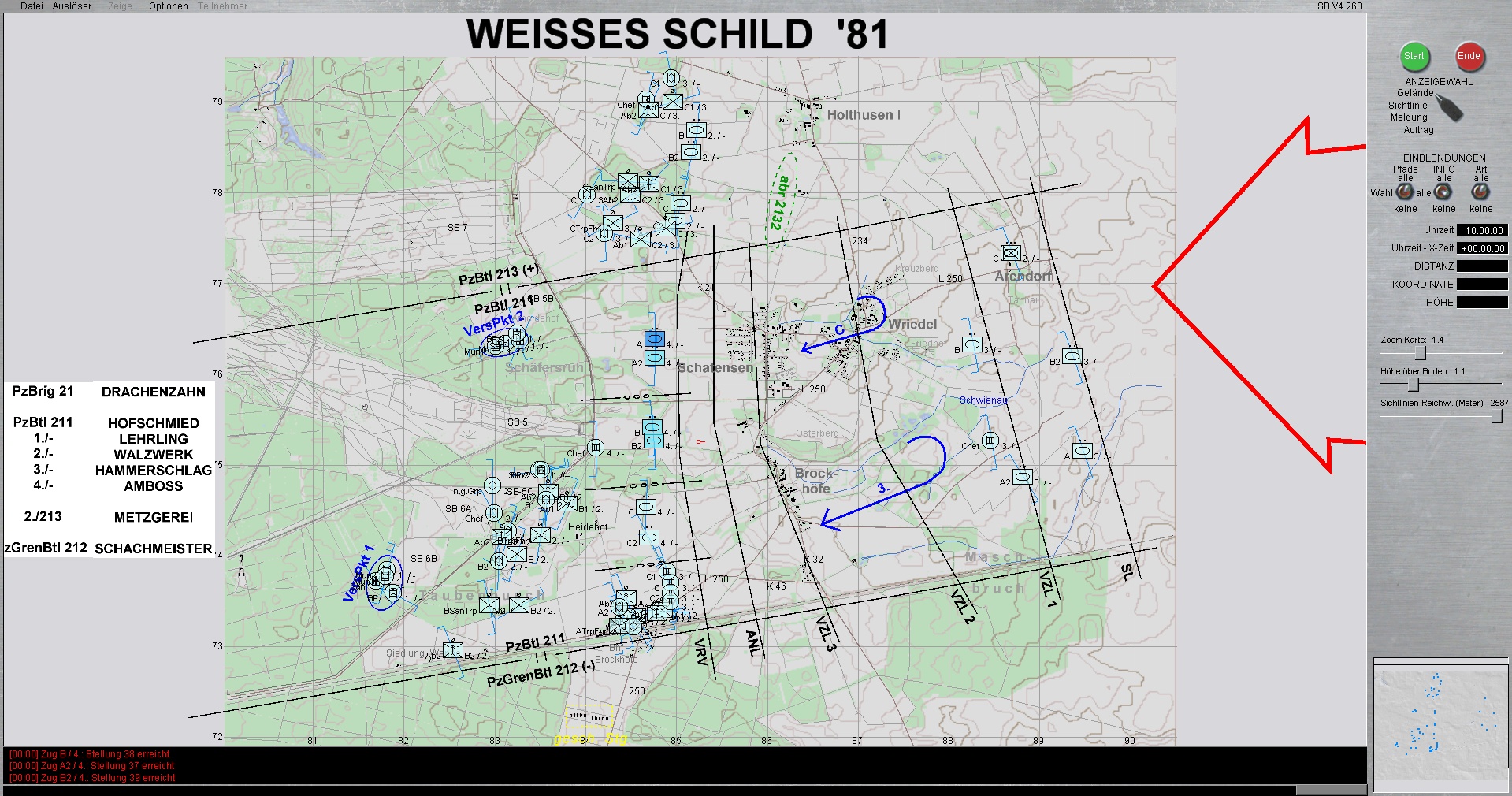 Verteidigung mit 2 Panzerzügen Leopard 1 A3 im Rahmen der Panzerkompanie am VRV eingesetzt. Eigene verstärkte Panzerkompanie (KI) voraus in der Verzögerung eingesetzt und verzögert Feind bis zum VRV. Es greift ein MotSchReg der NVA an.