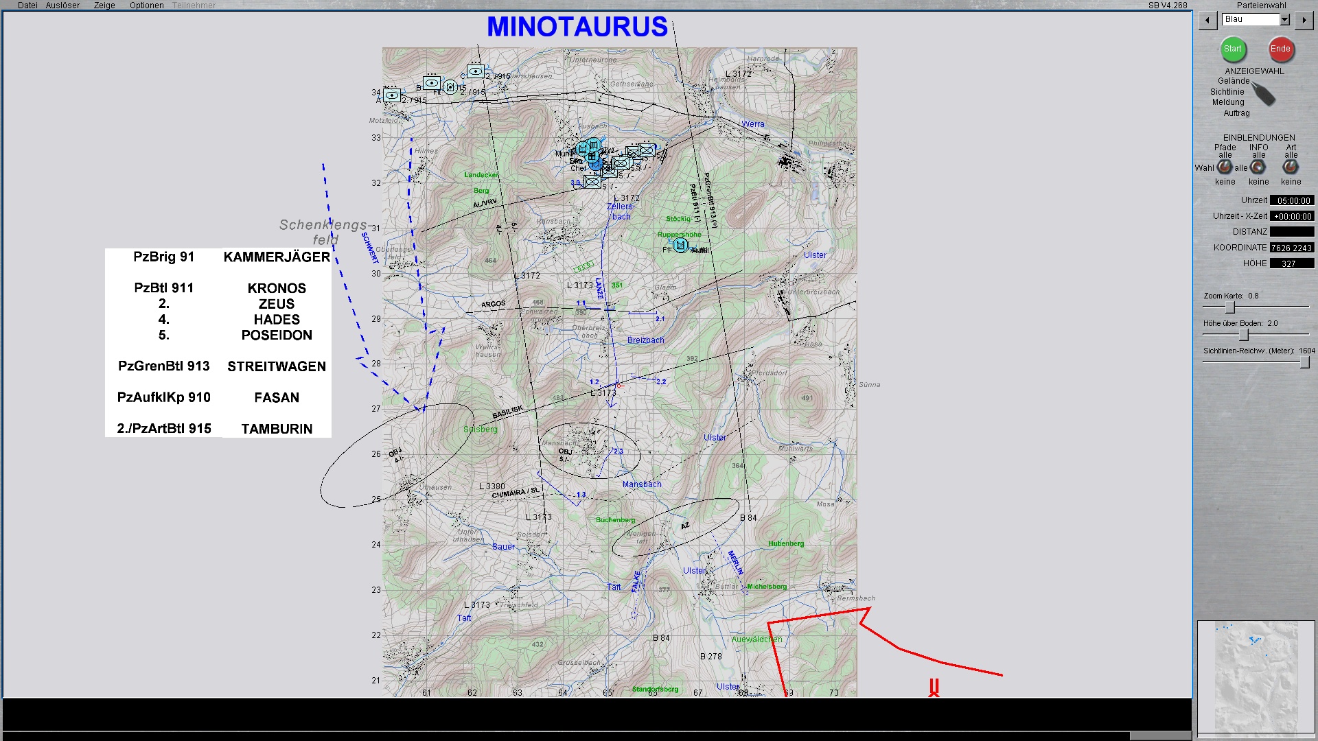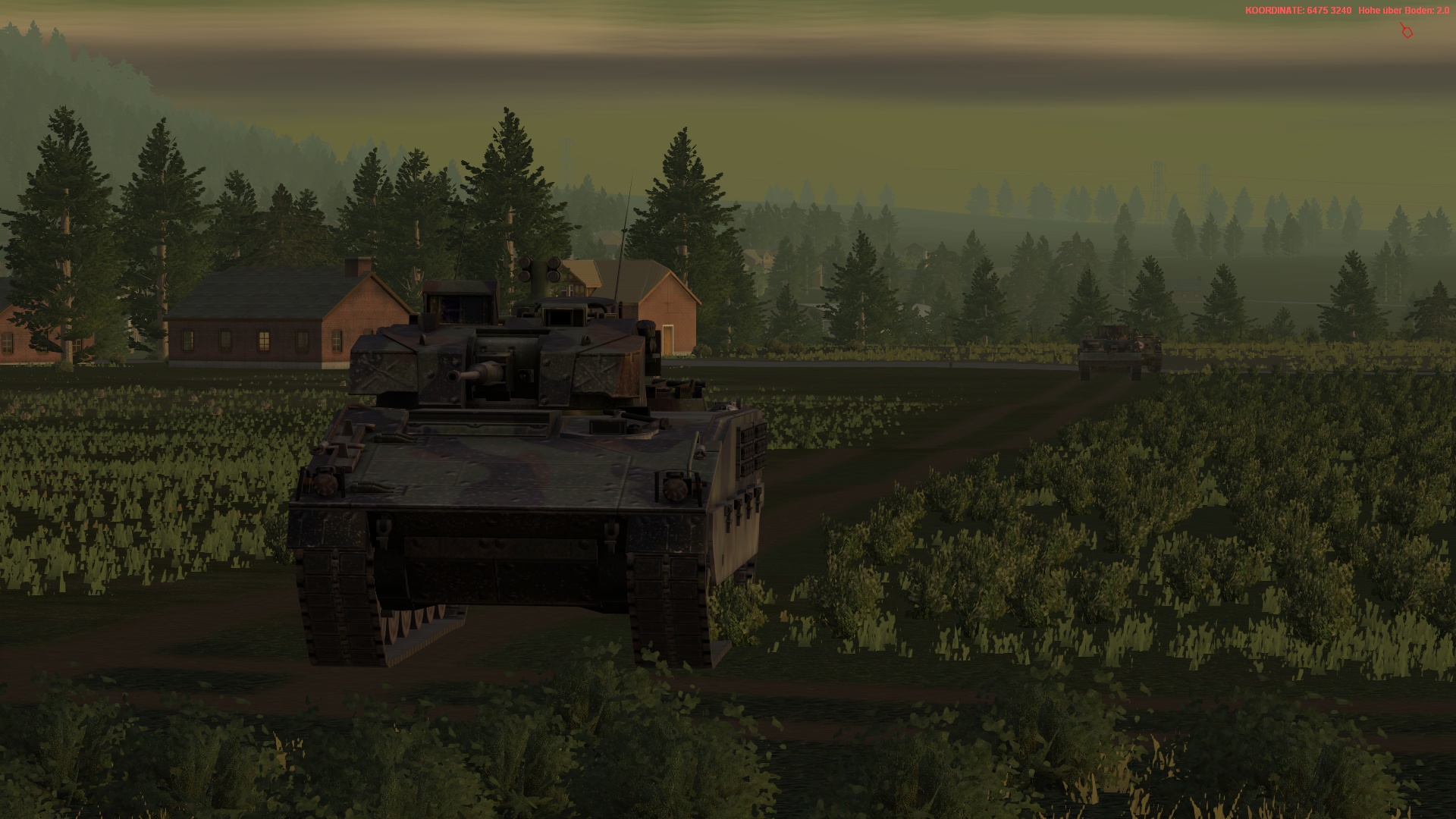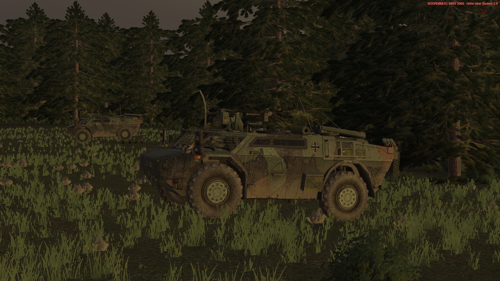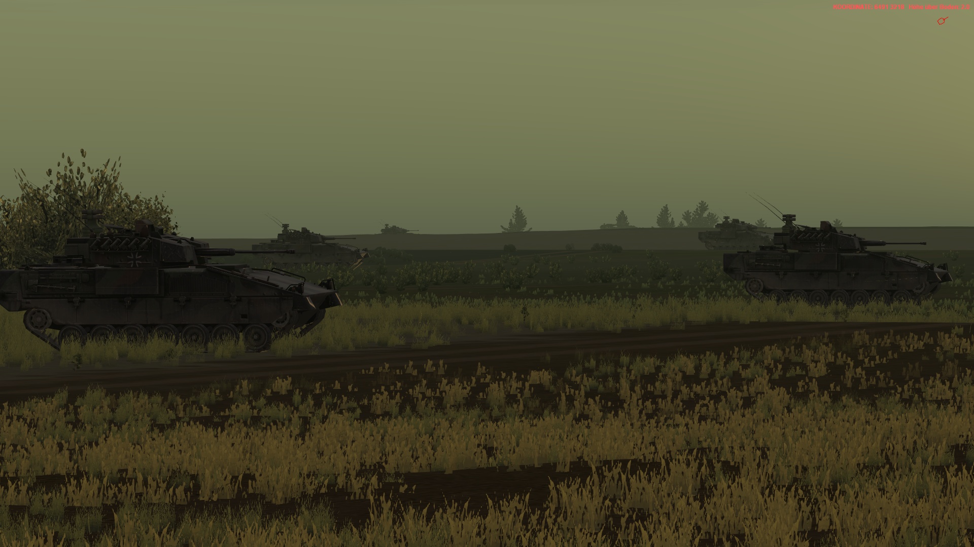 5.Kp, verstärkt durch einen PzZg im Angriff auf MANSBACH nördlich BUTTLAR. Voraus ist ein Spähtrupp mit 2 Fenneks, der nach Süden weiter aufklären und das AZ gewinnen sollen. Auf Befehl werden Diese ggf weiter im Zuge FALKE oder MERLIN aufklären.