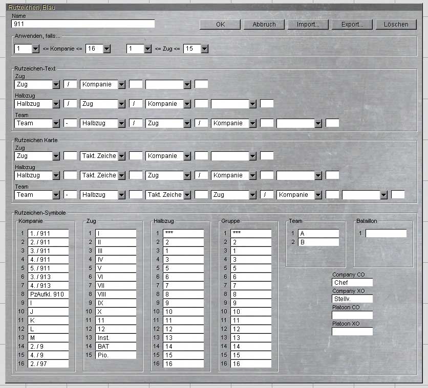 Das Template enthält die Rufzeichen für deutsche Einheiten (Bundeswehr).