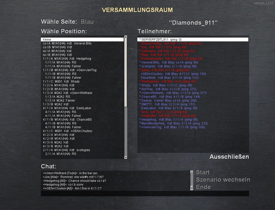 Ok altes Sce, noch von GsMcAmis IIRC, wer ihn noch kennt, was wird er wohl machen heutzutage.... War für gestern Abend "mal eben so" aus der Kiste gezaubert und könnte, was das verfügbare Gerät angeht etwas Feinschliff vertragen. Trotzdem muß ich Eisen beipflichten, was die Leistung angeht, eigentlich habe ich es aus der Sicht Rot selten anders verlaufen sehen. Was mich wirklich geärgert hat war der Verlust in der Strafzone, die man selbst mehr oder weniger subcortical gespeichert hat, für neue Teilnehmer aber schlecht oder nicht ausgewiesen ist. Am besten ist natürlich- insbesondere bei derlei Szenarien (große HTH) auf dem Teppich äh der Karte zu bleiben ![]()