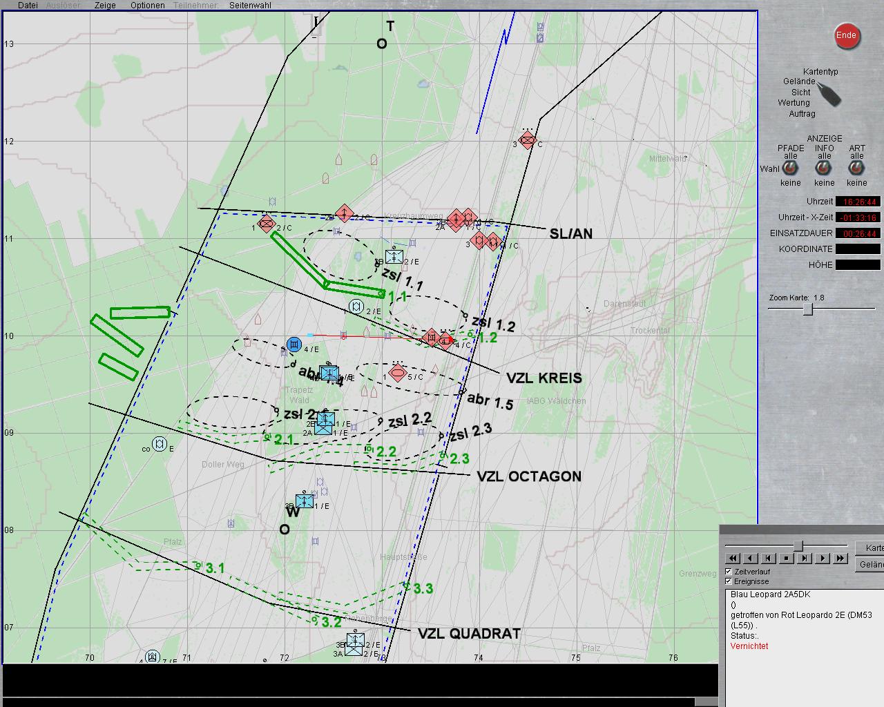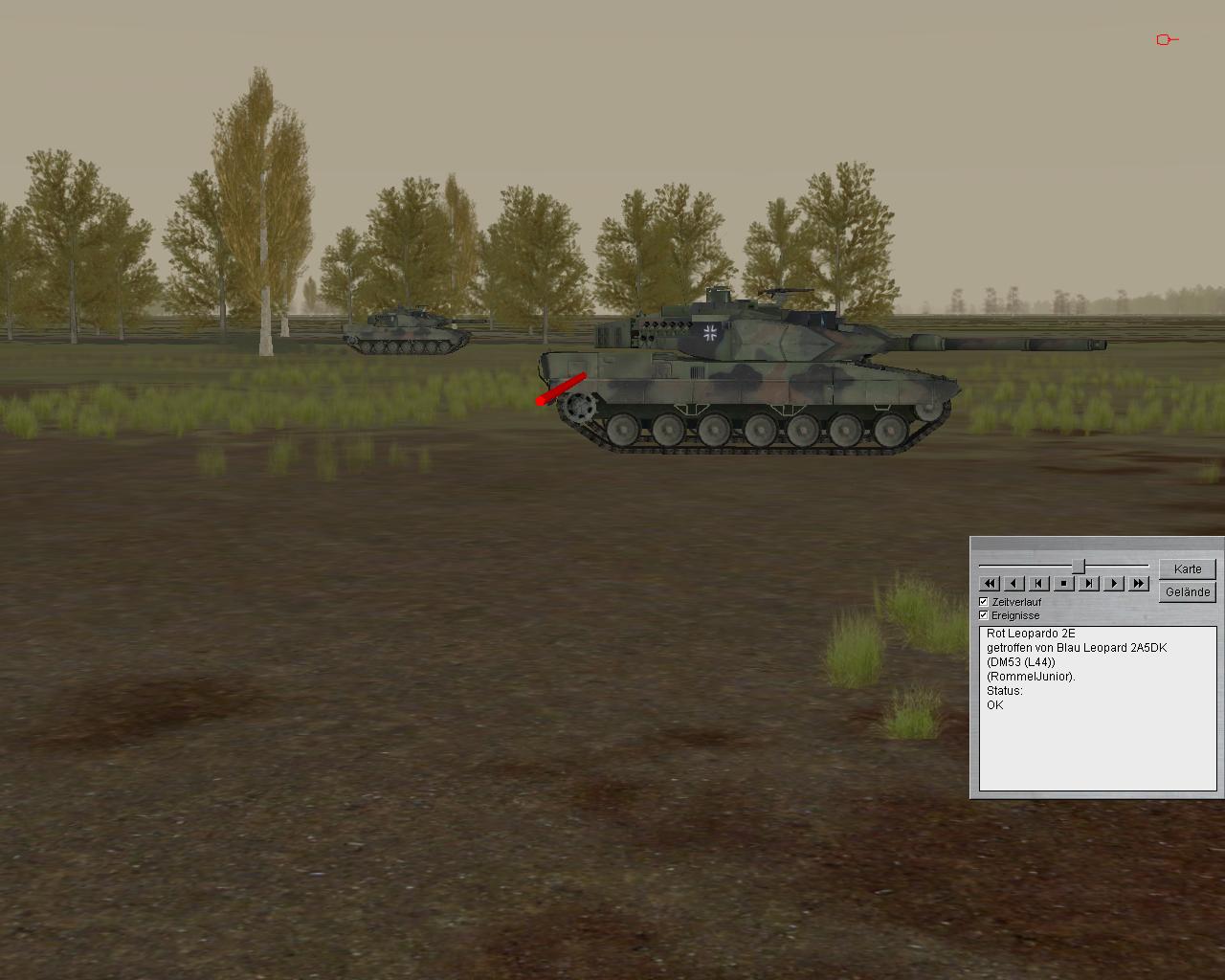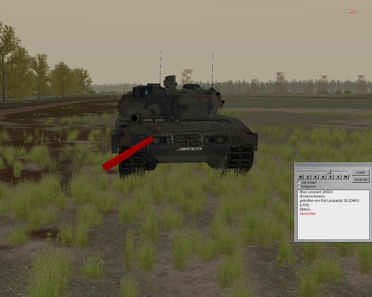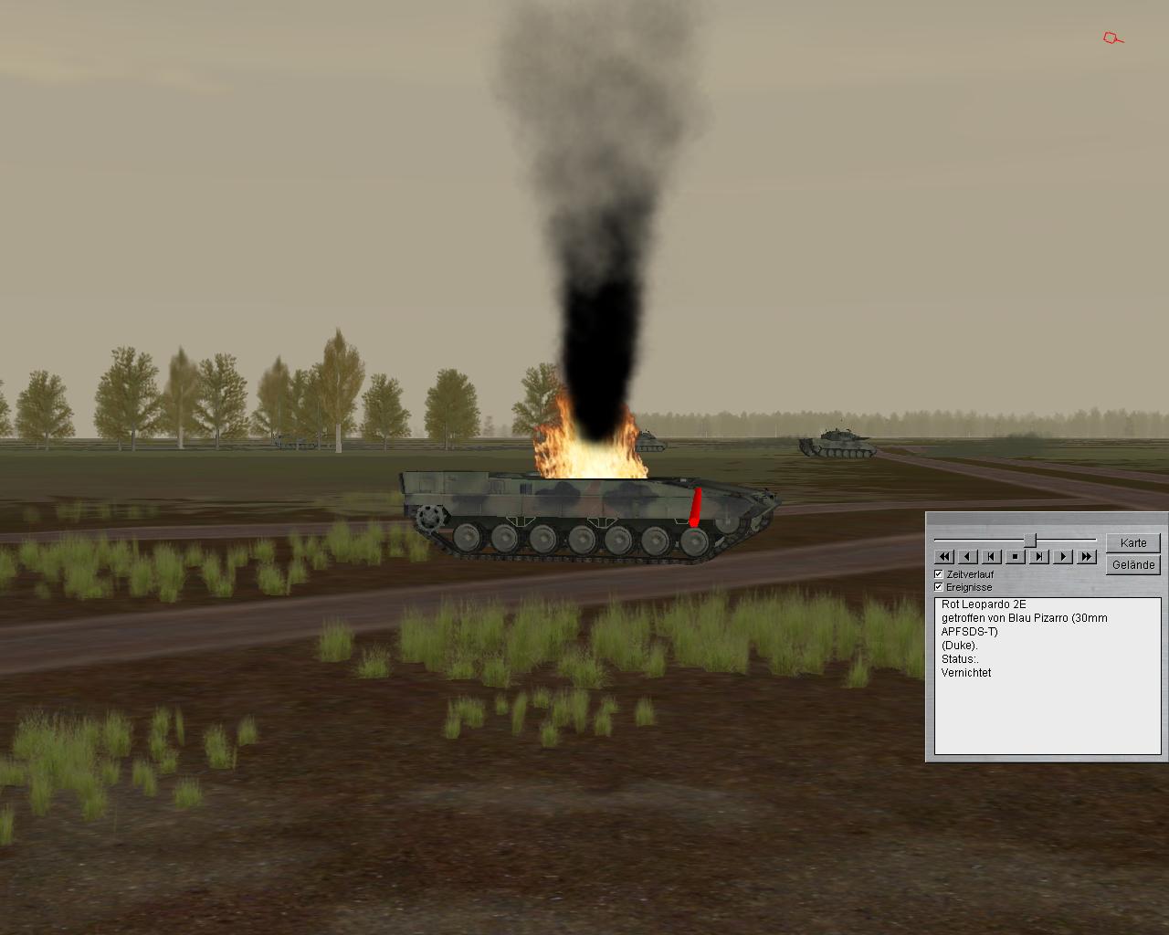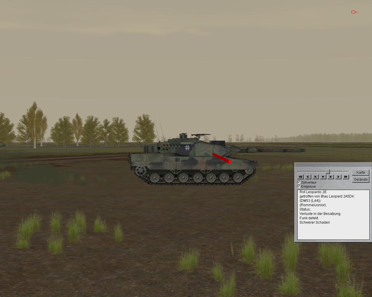 - ein Pizarro einen Leo 2 im oberen, hinteren Heckbereich getroffen hat und insoweit Schäden an Hilfsstromaggregat und Batterien (nicht modelliert) sowie Motorkühlung (modelliert, aber derzeit noch ohne Konsequenz) zu erwarten wären