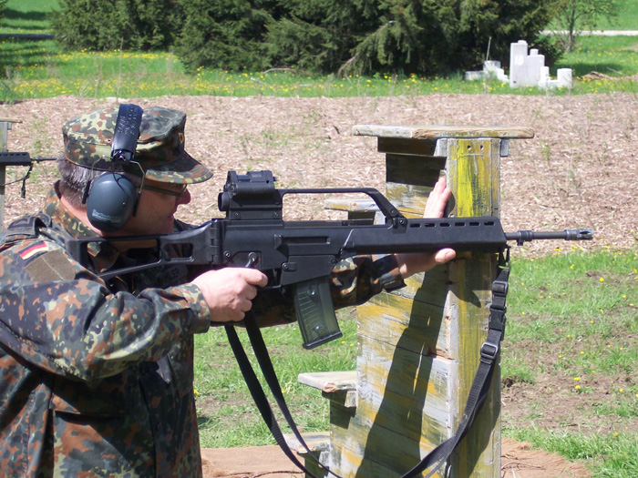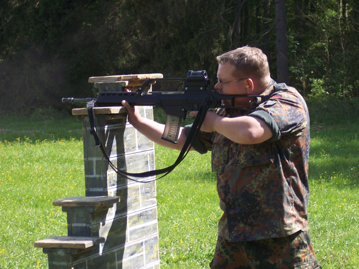 Das brauch ich nicht , treffe auch so:D . Auf der Schießbahn nebenan war die KSK zu Gange, da hättet ihr mal deren Anzüge,Gehörschutz, Waffen usw. sehen sollen . NIX Vorschrift = 2 Trupps gingen vor, an einer Hauswand tauchten Scheiben auf und dann kam die "Faust Gottes". Die haben mit allem auf das Haus geballert was sie dabei hatten , incl. Granatwerfer.:eek: