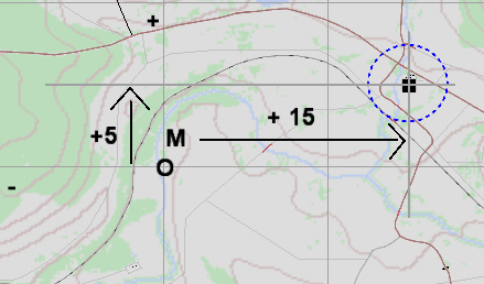 Beispiel Bild2: Das markante Gebäude in dem Kreis hat die Koordinate zu Mike: (Ost-West) +15 (Nord-Süd) +5