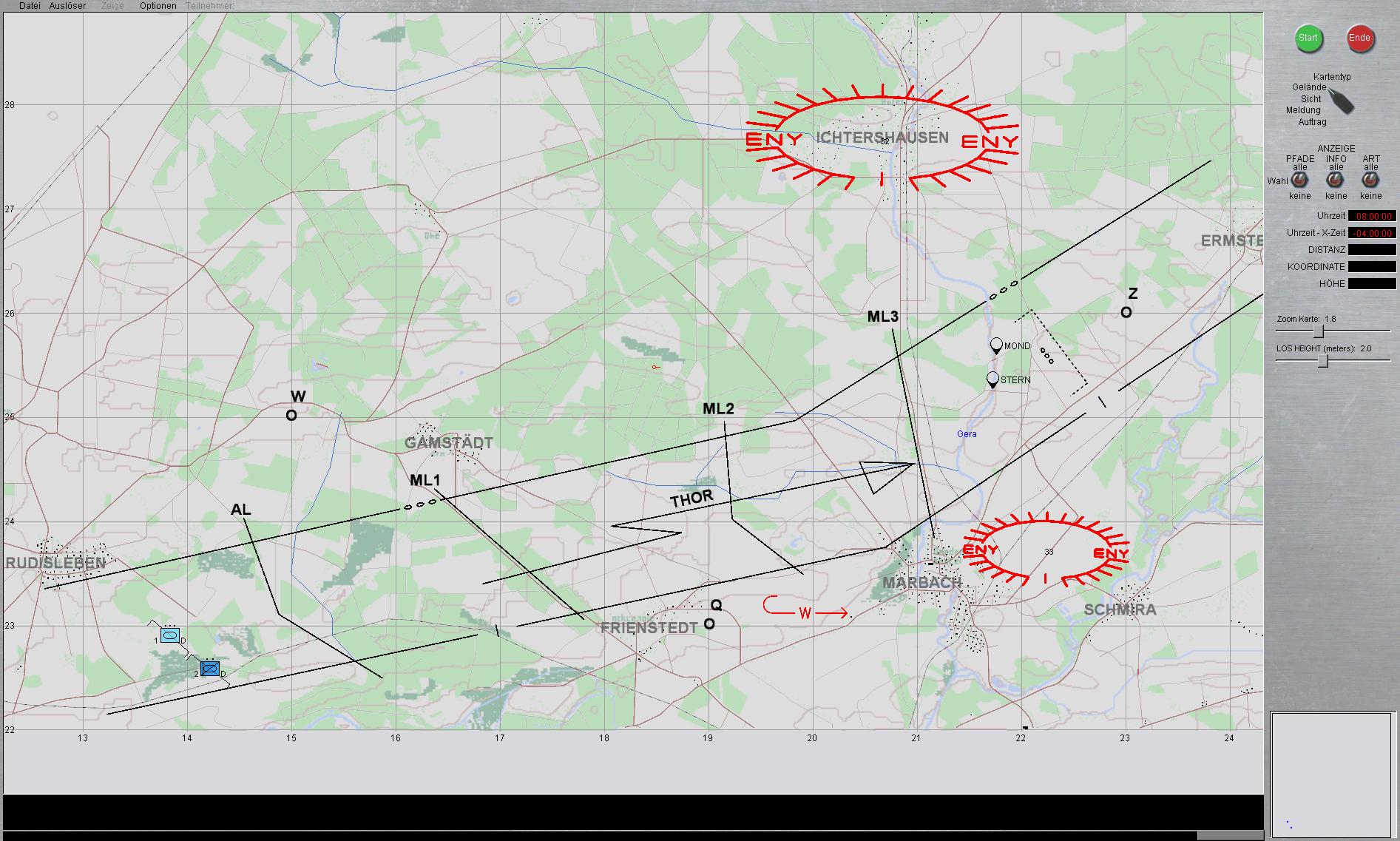 [/INDENT][INDENT][INDENT]Panzerbataillon 911 (+/-) ist durch vorangegangen Angriff bis auf Höhe RUDISLEBEN vorgekommen, reorganisiert und führte Versorgung mit MVG durch. Das PzBtl 911 hat die Fühlung zum Feind verloren. Meine Absicht ist es mit Spähtrupp A Zug + 1/2 B Zug voraus Höhe GAMSTÄDT und FRIENSTEDT Aufzuklären und die Übergänge MOND und STERN über die GERA im schnellen Stoß zu nehmen und zu halten, um eine günstige Ausgangssituation für den weiteren Angriff zu haben.