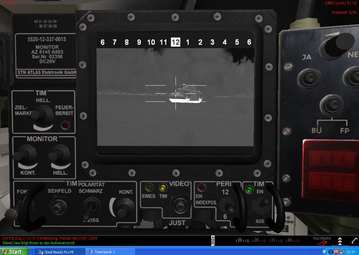 ich hatte, glaub' ich in game angefragt, ob man die Tunguska nicht mal mit "Feuer Halt" belegen könnte. Wären die Leo's nördlich von ZZ2 nicht schon angeschossen und kampfunfähig gewesen, wäre es um die in manchen Situationen sehr hilfreiche Tunguska geschehen gewesen. Das ist nun mal nicht die erste Wahl zum Bekämpfen von Panzern, auch wenn's hübsch ausschaut und sich gut anhört :p