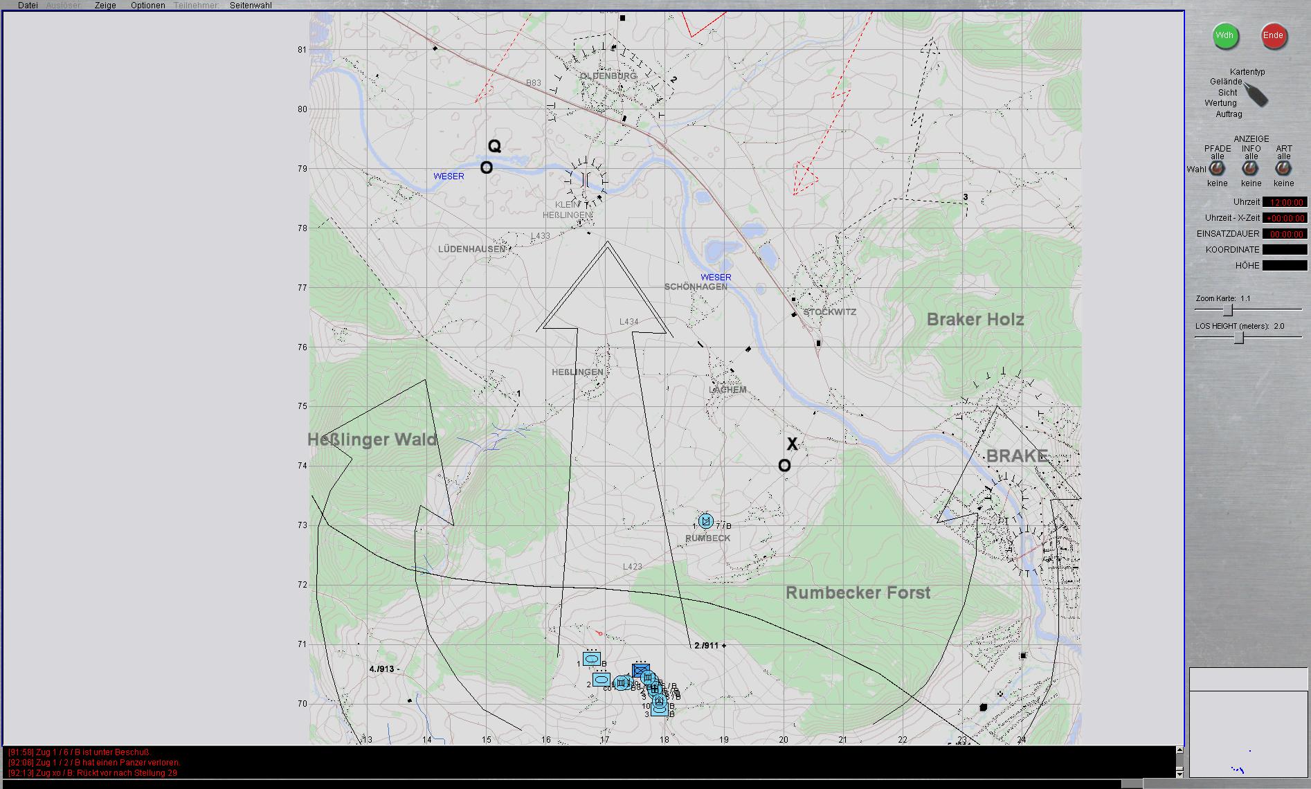 [/INDENT][INDENT][INDENT]Im Angriff aus N mit Spitzen ca. 20 km NNO OLDENBURG – BRAKE gelang es blaue VzöKr in Stärke eines MSR BMP/T-80 in Richtung WESER-Übergänge durchstoßen.