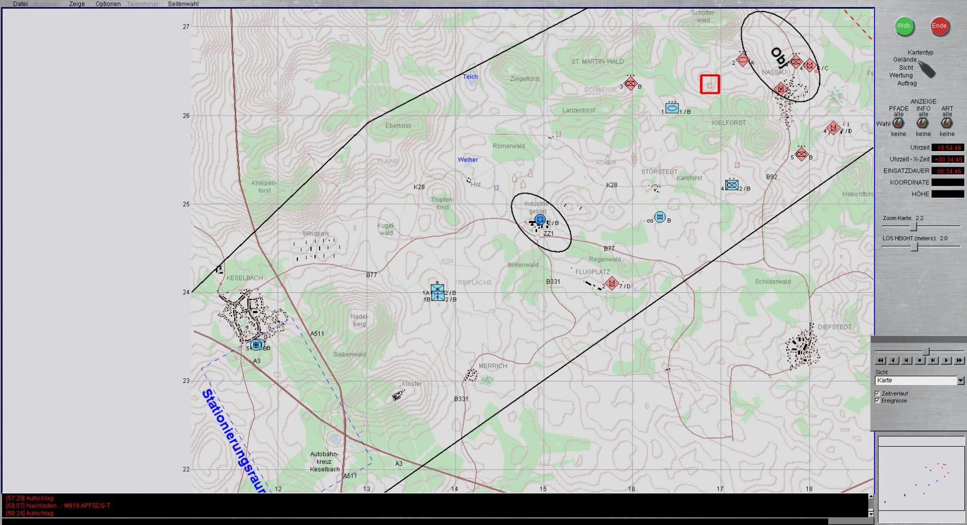 Da wo eigentlich Kampfpanzer erwartet werden tauchen Spz auf und umgekehrt. Also komplett falscher Ansatz der Kräfte, was auf BLAUER Seite dazu führt kein aussagekräftiges Lagebild zu erzeugen. Zudem erschließt sich der Auftrag des ROTEN Bataillons glaube ich Niemanden.- ROT greift an