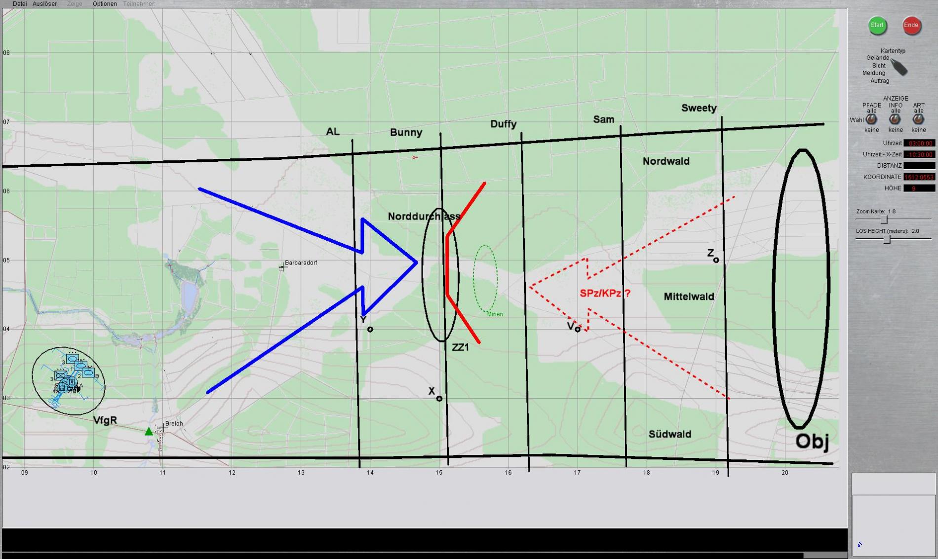 [/INDENT][INDENT][INDENT]Öffnen des Norddurchlasses und zerschlagen dortiger Feindkräfte mit panzerstarken Vorauskräften, so dass anschließend mit den Hauptkräften 911 weiter Richtung WRIEDEL angetreten, Stellungen genommen und verteidigt werden kann.