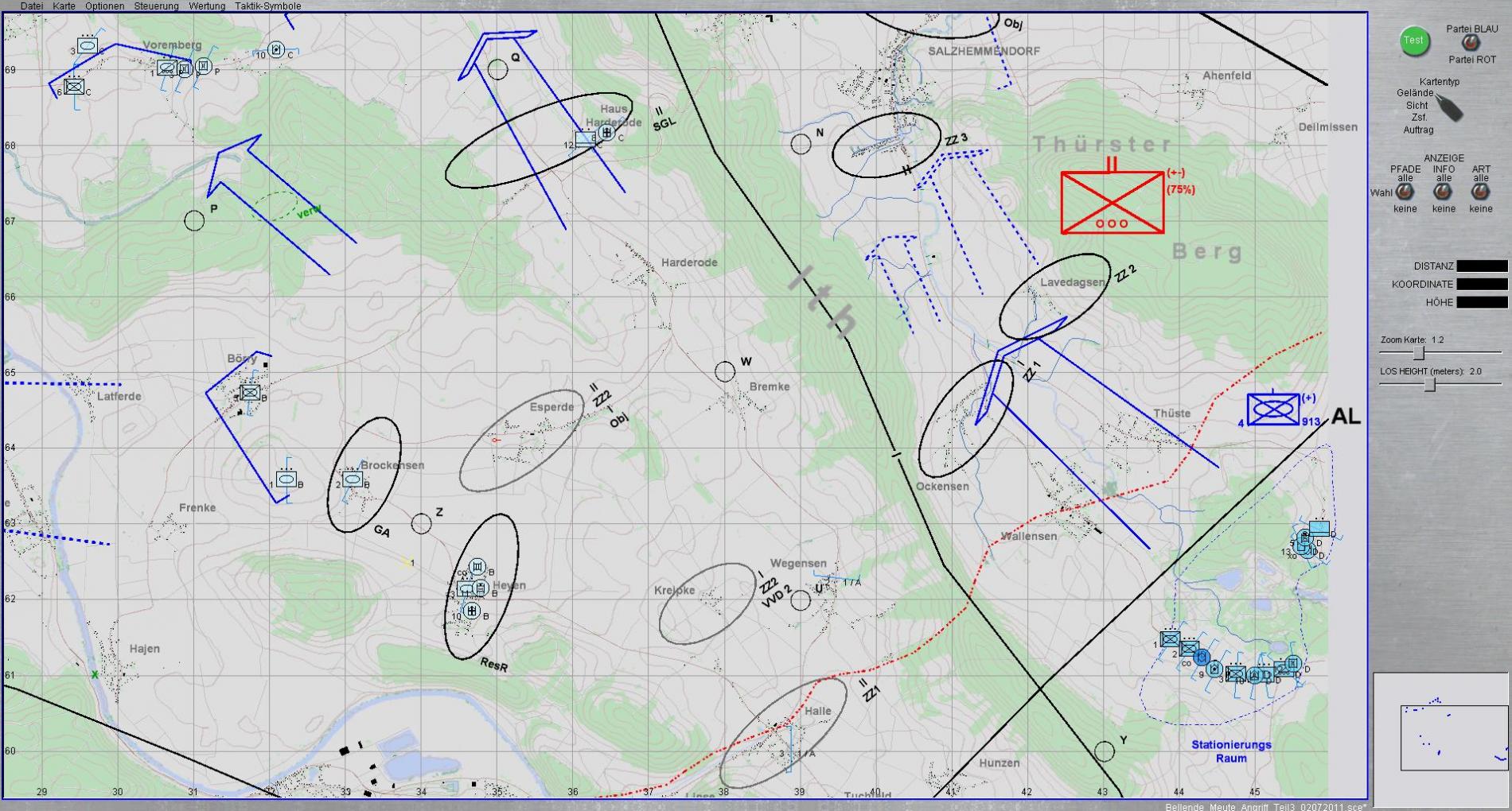 in die tiefe linke Flanke des Gegners anzutreten. Spitzen 911 im Obj. und X92 kurz hinter AL, treten aus der Bewegung an und nehmen Brückenkopf HAMELN und Raum südlich davon.