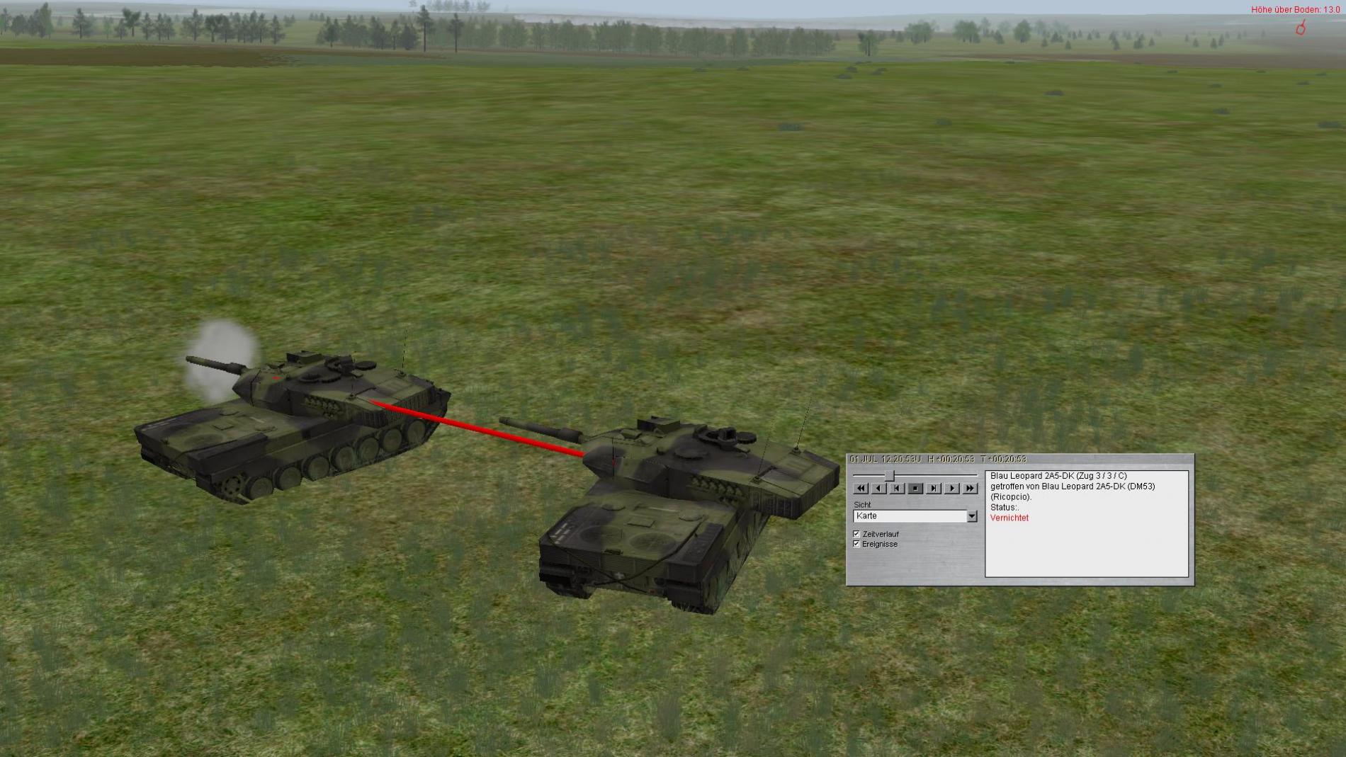 Ich mit dem hintereren Panzer war eigentlich beim Ausweichen etwas schneller,hab dann aber kurz gestoppt um mir einen kurzrn Überblick zu verschaffen weil wir aus zwei Richtungen beschossen wurden.Als dann das KI-Teil auf meiner höhe war hat mein KI- RS gefeuert. Das ganze ging so schnell,wurde mehr oder weniger von links überrascht,denn ich hatte einen anderen Beobachtungsbereich.