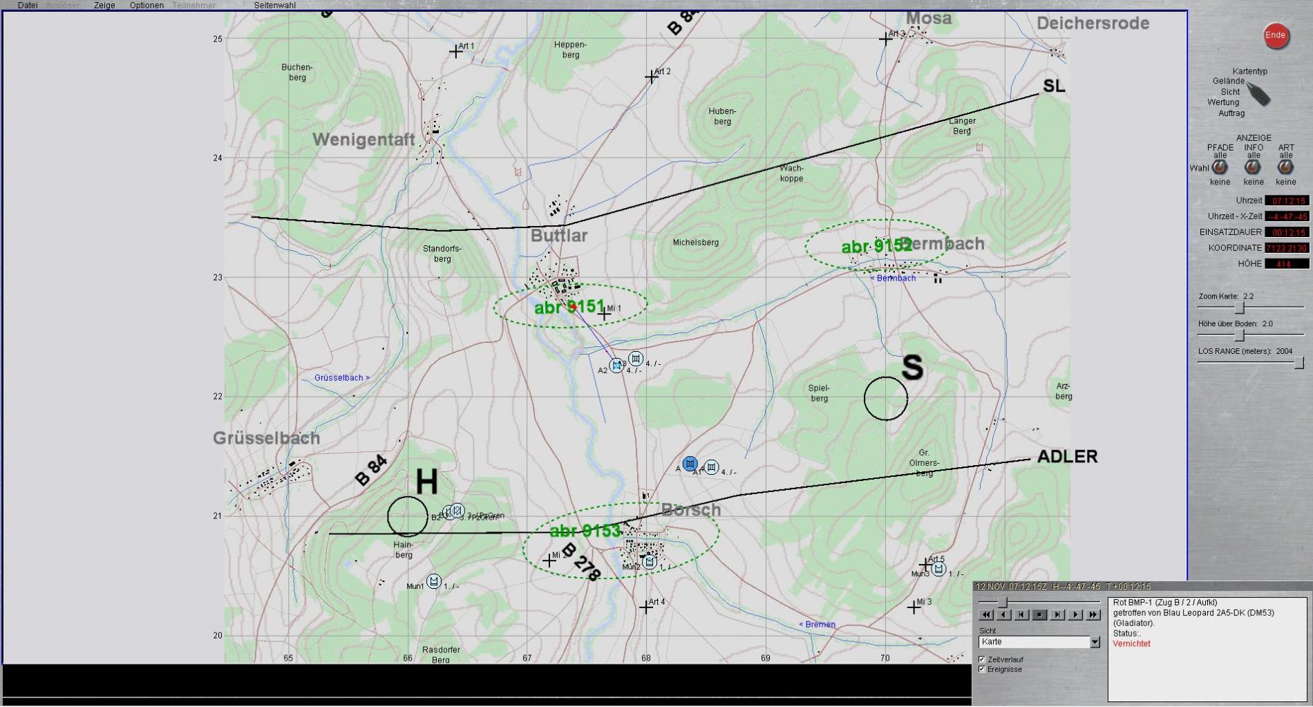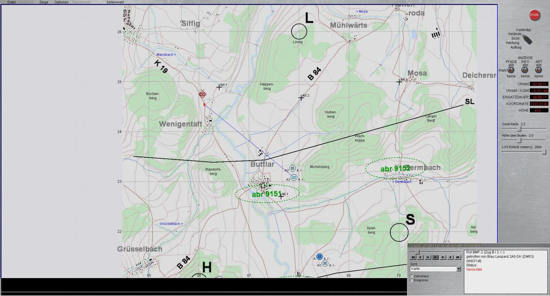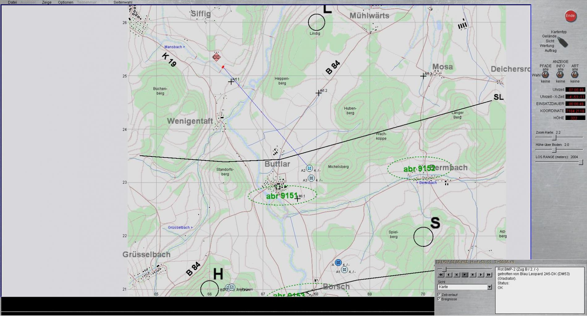 B2 meldet blenden vor eigener Stellung und BMP in Zugstärke im Zuge der Bundesstraße 84 mit Bewegungsrichtung BUTLAR; führt Feuerkampf mit LFK.