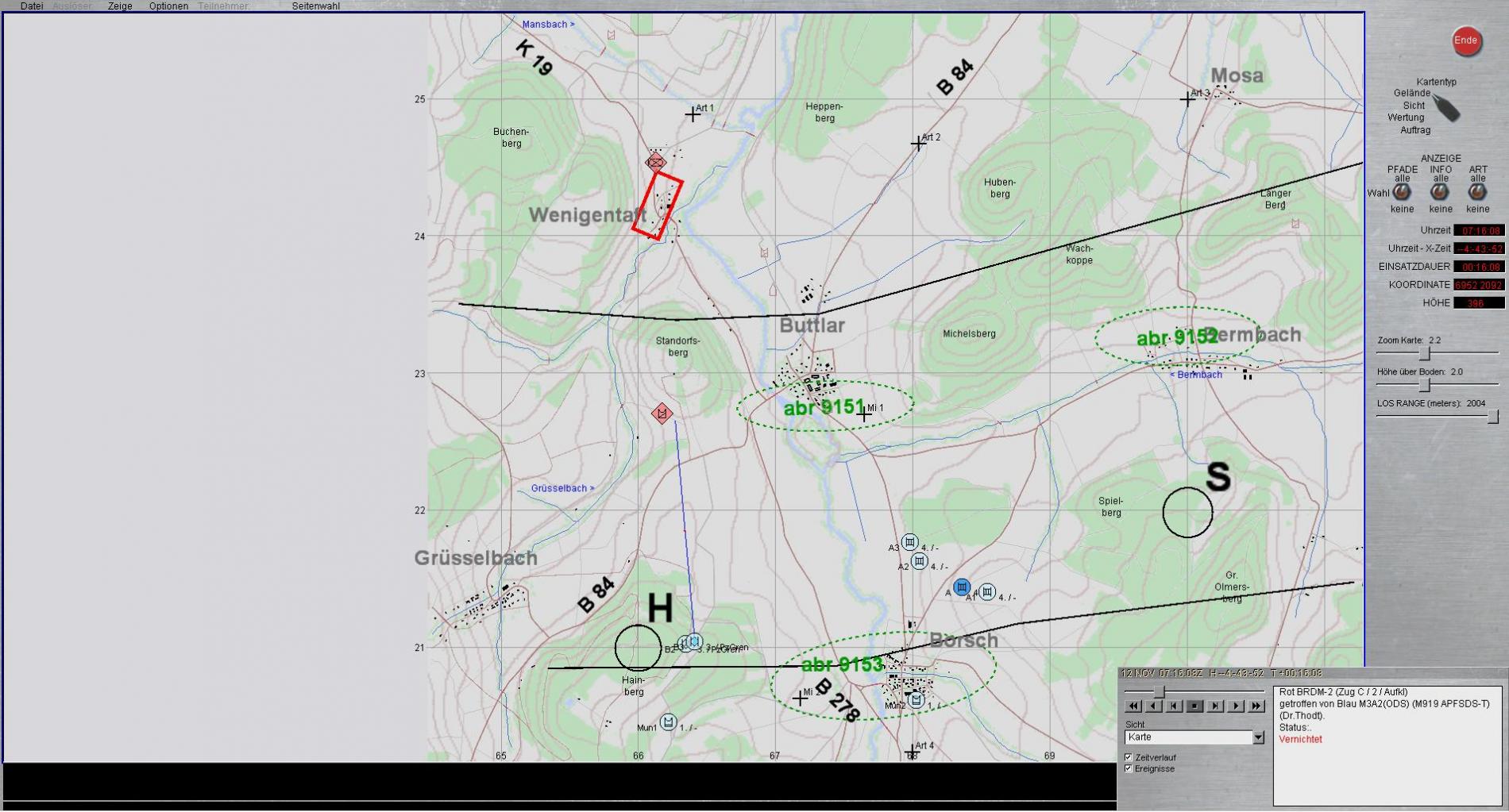 A2 meldet BMP Zug nördlich Butlar, Bewegungsrichtung Süd, kann aber nicht wirken.Vermutete Absicht des Fd.: Fd. greift mit Nebenstoß auf BUTLAR an.