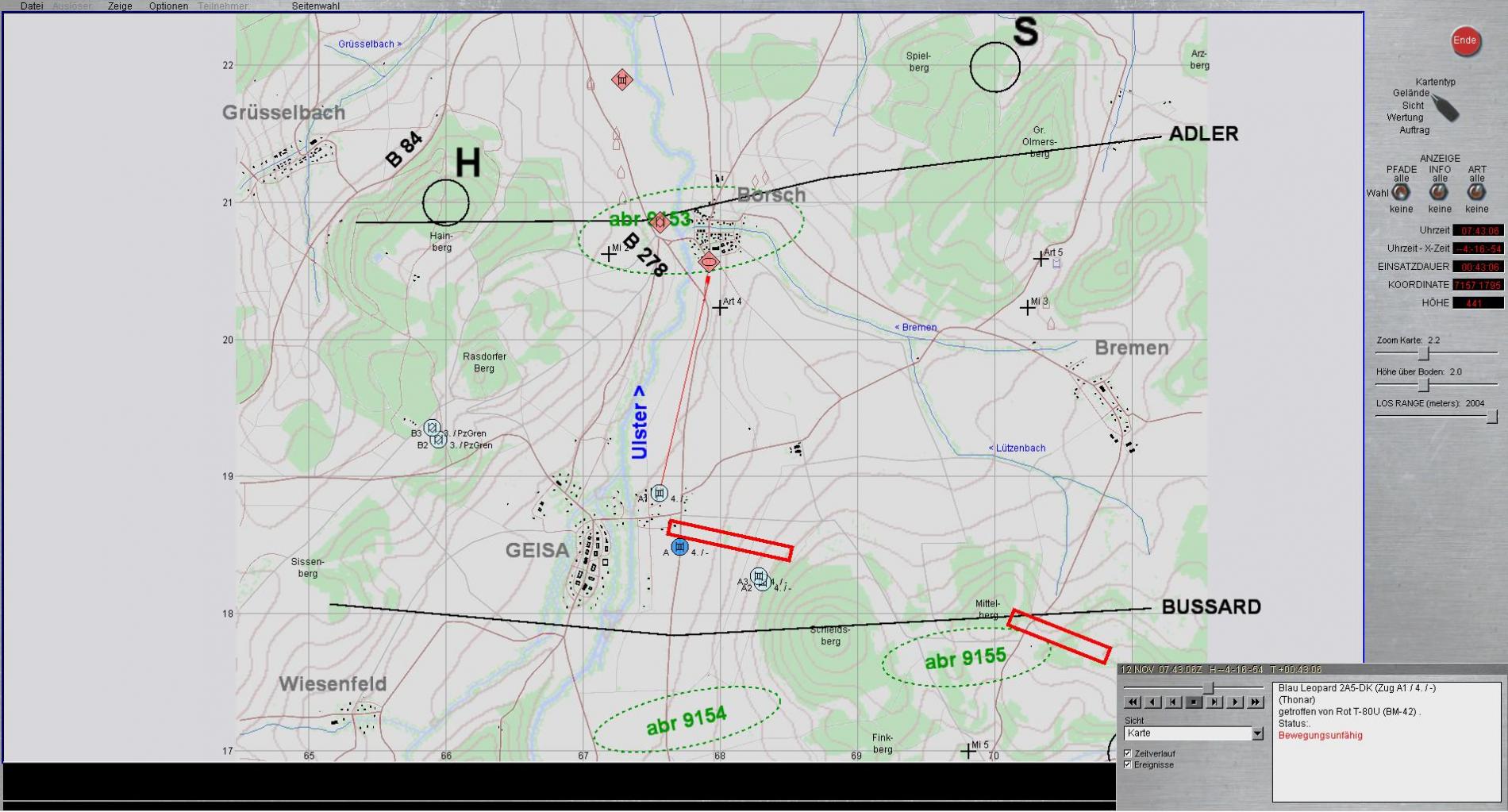 Entschluss: Anfordern sofort abriegeln nördlich WENINGENTAFT für 3 Minuten, ausweichen A2 auf Wechselstellung ADLER mit Artilleriefeuer im Ziel.