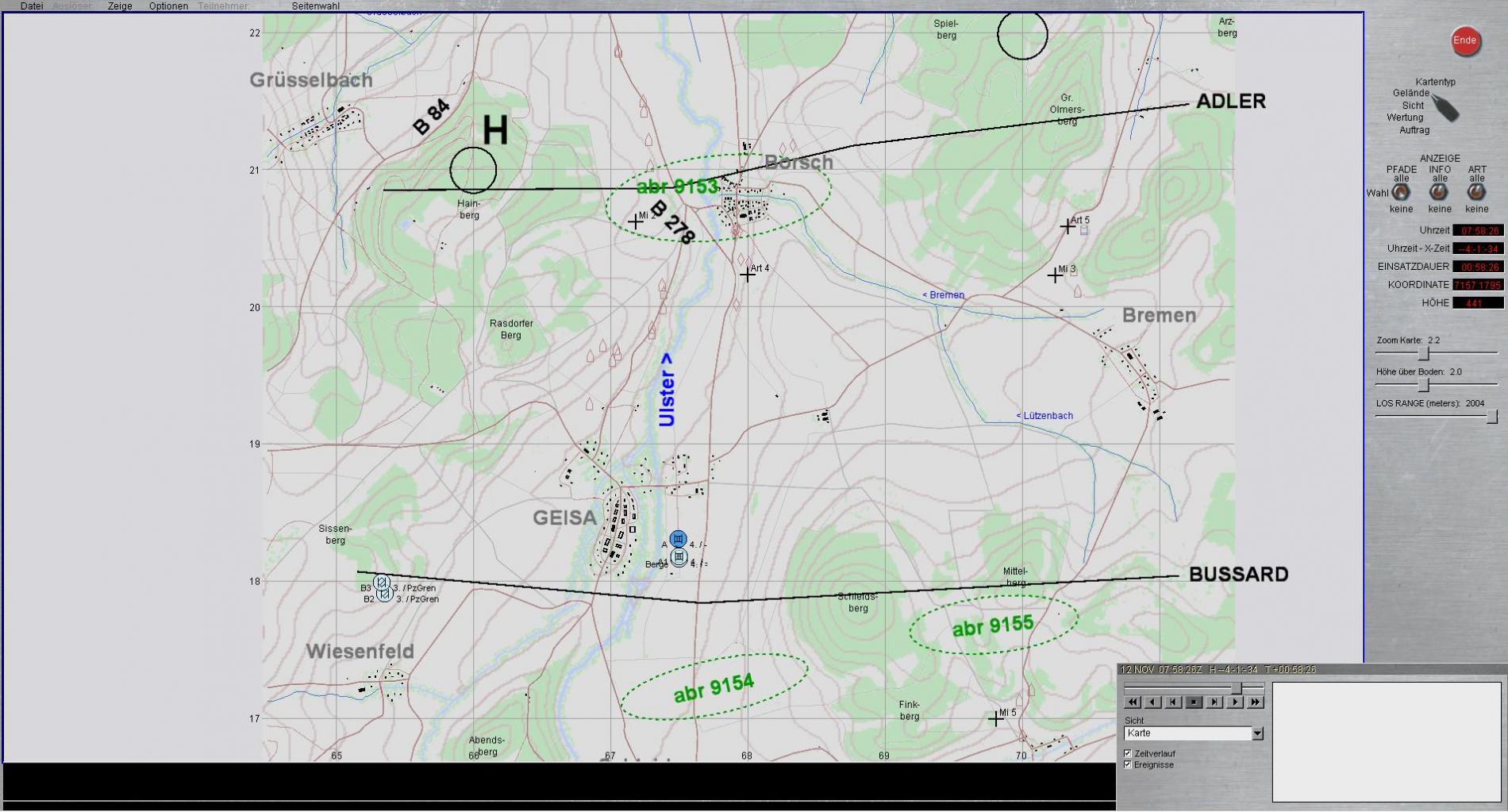 Entschluss: Wiederholen Abriegeln 9153, B2 sofort ausweichen auf Stellungen RASDORFER BERG und überwachen Freifläche südlich BORSCH; A sofort ergänzen Munition, danach Stellung im Zuge Ostrand GEISA so, dass auf Ortsausgang BORSCH überwacht werden kann; A2 verbleibt in derzeitiger Stellung und überwacht BORSCH.