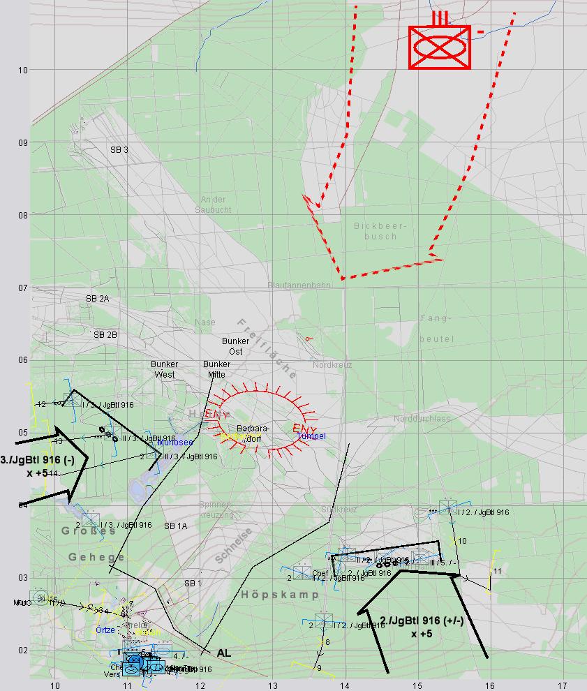 Feind ist mit Luftlandekräften bei BARBARADORF gelandet und sichert die Ortschaft. Das nachstoßende Mech. Regiment tritt allgemein auf MUNSTER-BERGEN an.