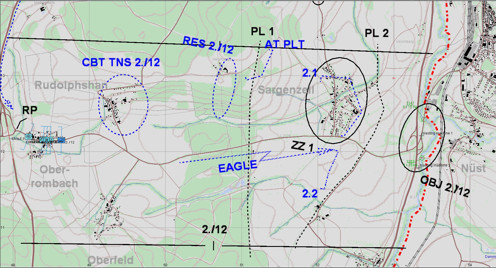[/INDENT]2)mission[INDENT]Intention of OC 2./12 is to defend along the SL. Main effort is to observe the ridge south- eastwards NÜST, to deny an enemy attack to take crossing points 3347 and 3352, to give the rest of our btn the time to go in positions.[/INDENT]