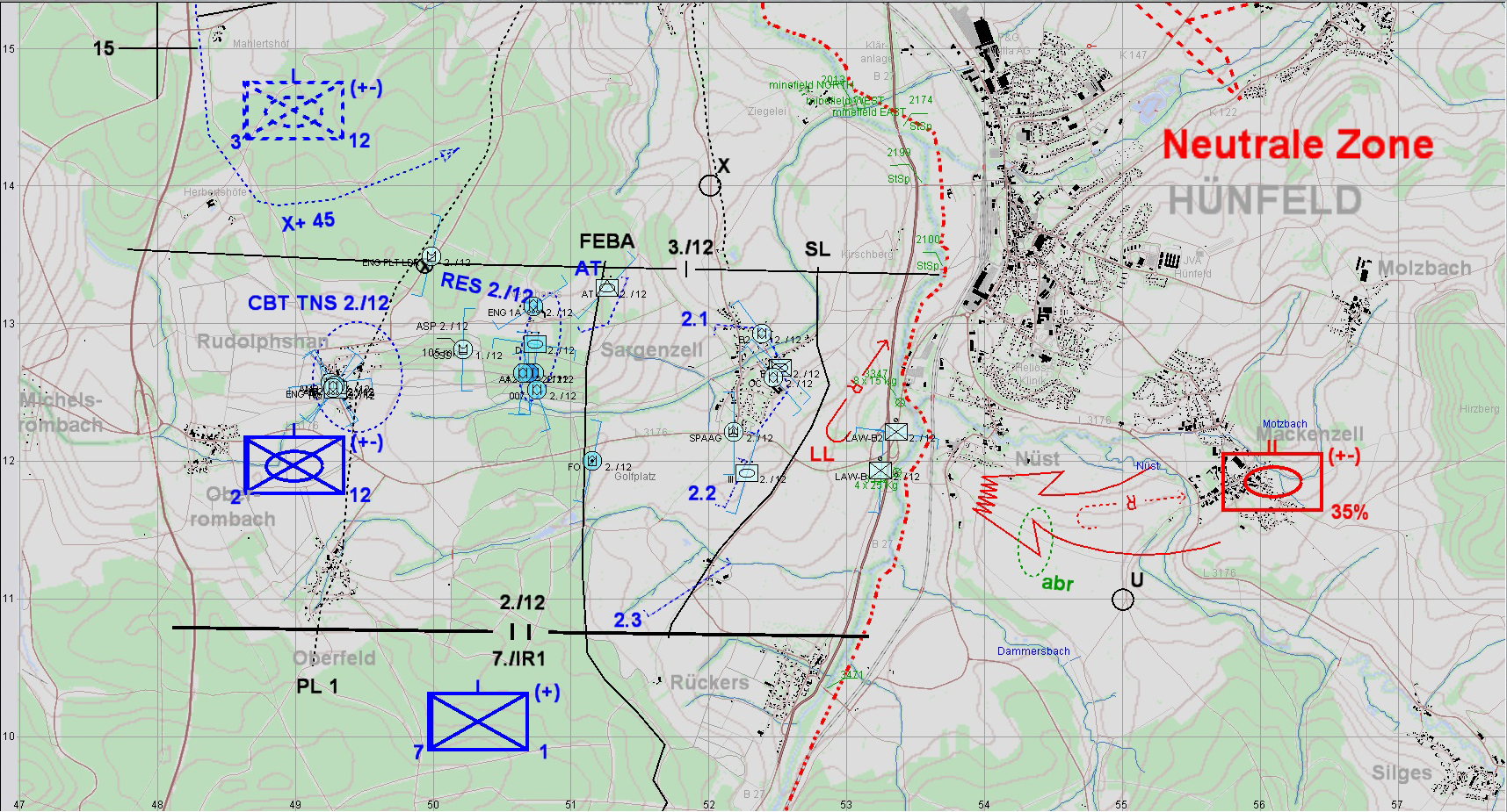 [INDENT]First echelon of an enemy tank battalion (+-) and air assault forces in company strength are defeated in the area SARGENZELL - RÜCKERS - NÜST to 65%.[/INDENT]