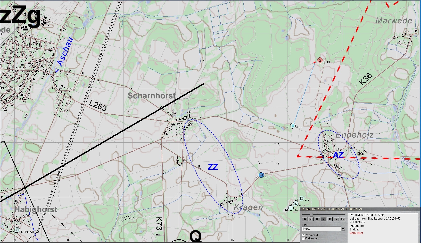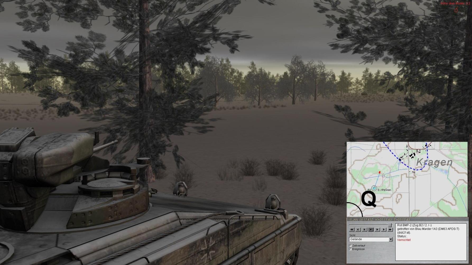 Nach Erreichen des Bereiches ENDEHOLZ setzt B2 seine Schützen in Stg 3 ab und gewinnt mit A2 Stg 2; A3 verbleibt in Stg 3. Fdl. Aufklärung wird vernichtet.