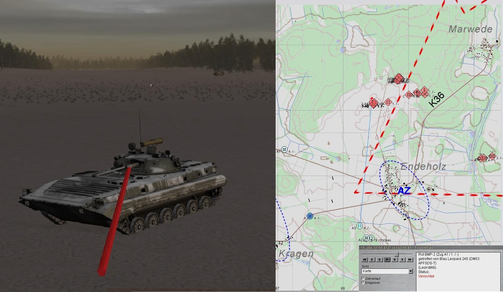 ROT führt nunmehr seine vorderste BMP-Kp ein, die im Feuer des vstkPzZg aus Stg 1 und 3 jedoch liegenbleibt:
