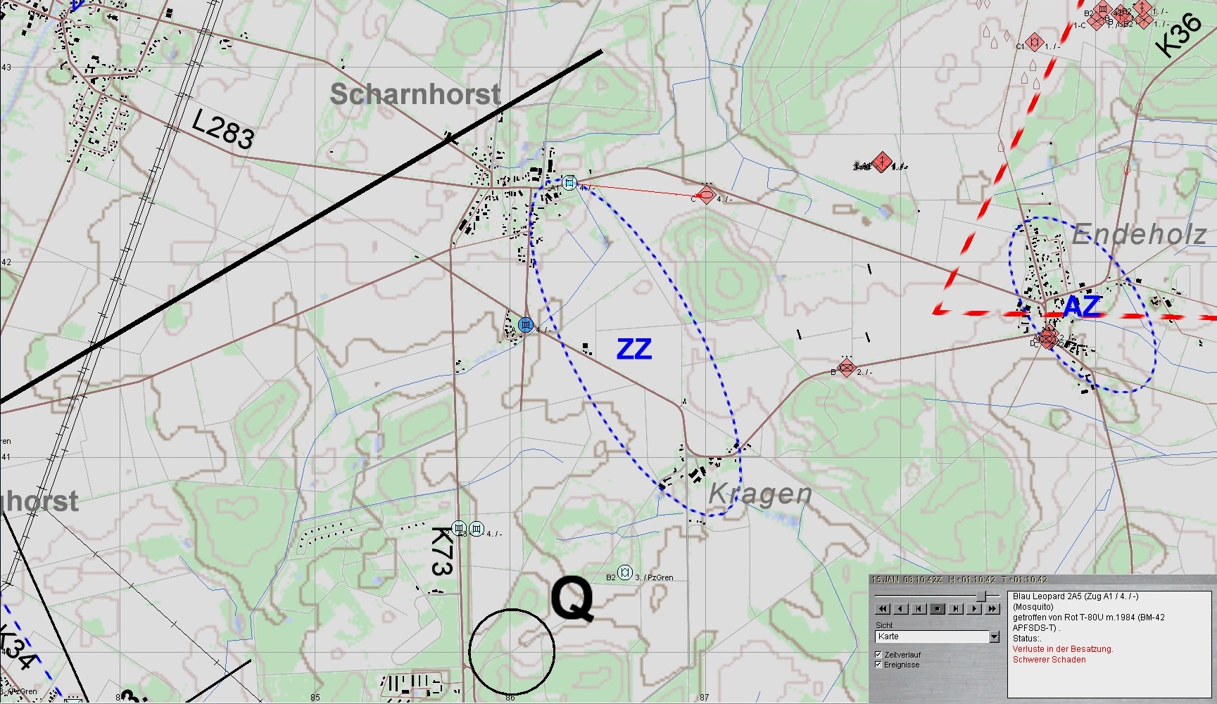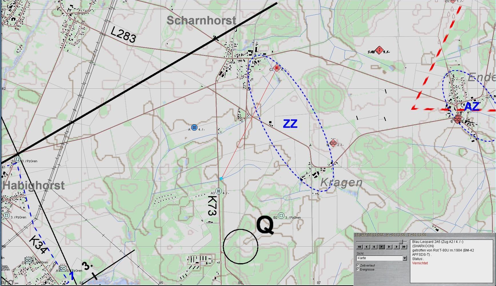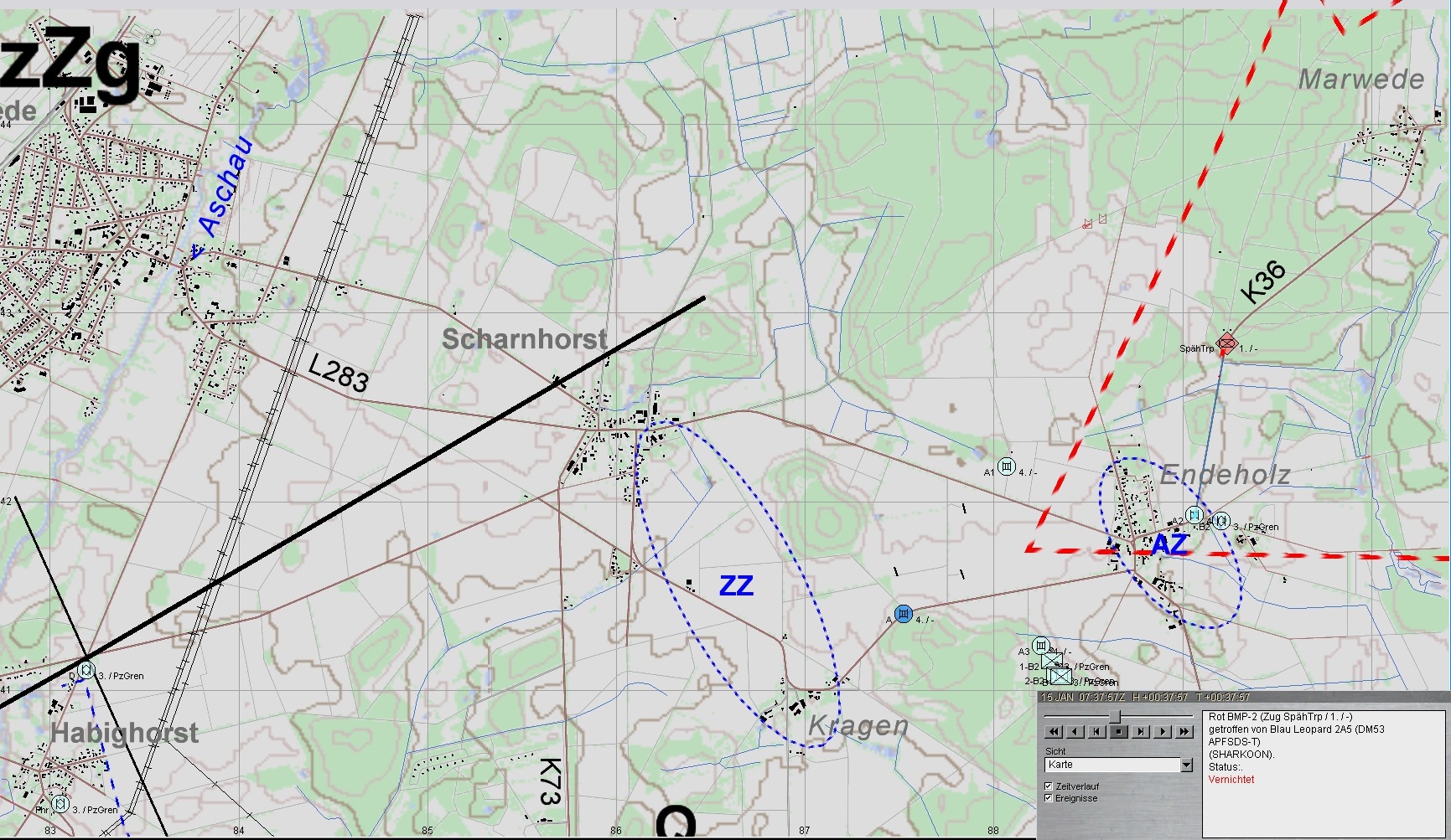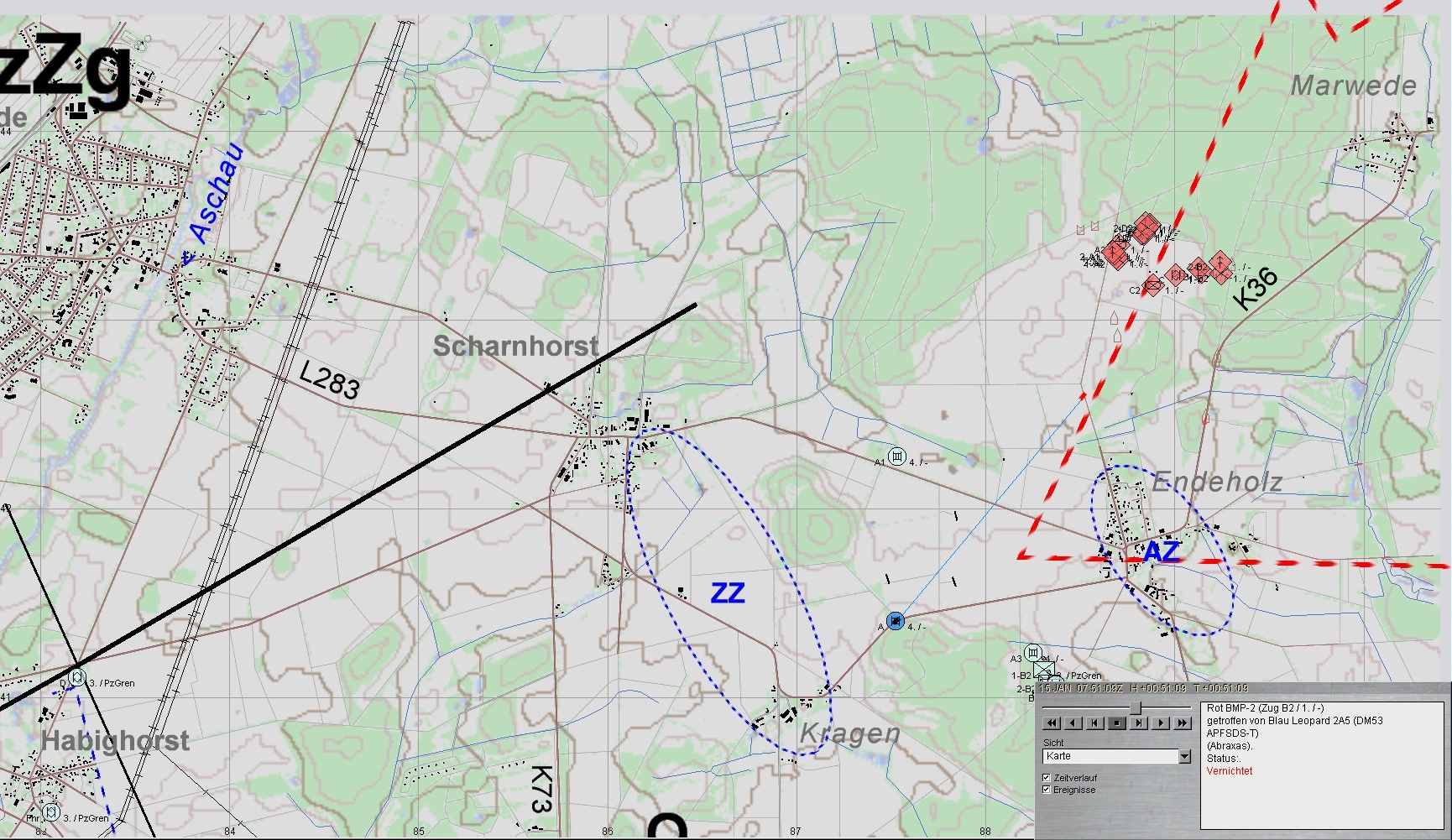 Nach Erreichen des Bereiches ENDEHOLZ setzt B2 seine Schützen in Stg 3 ab und gewinnt mit A2 Stg 2; A3 verbleibt in Stg 3. Fdl. Aufklärung wird vernichtet.