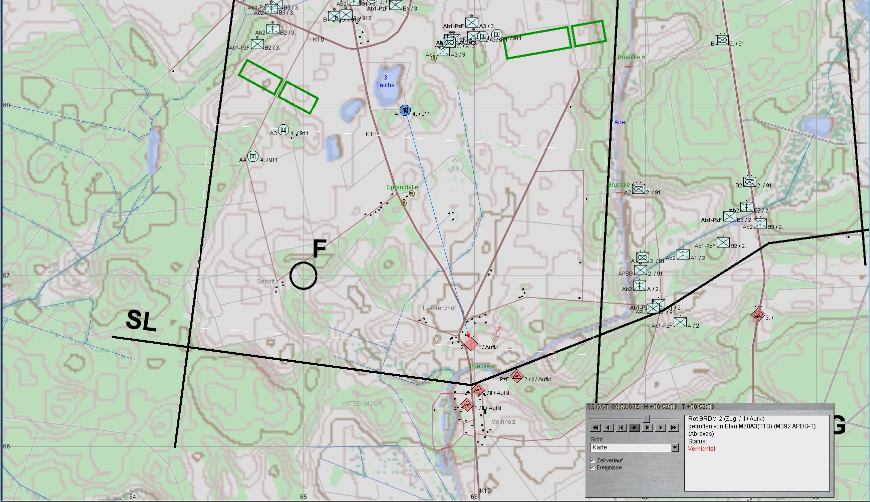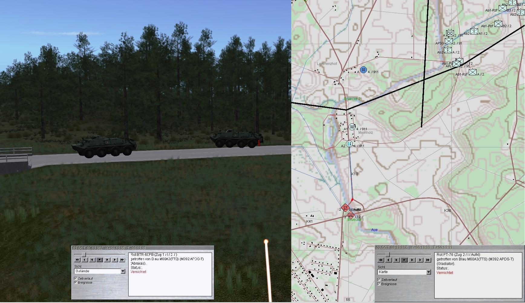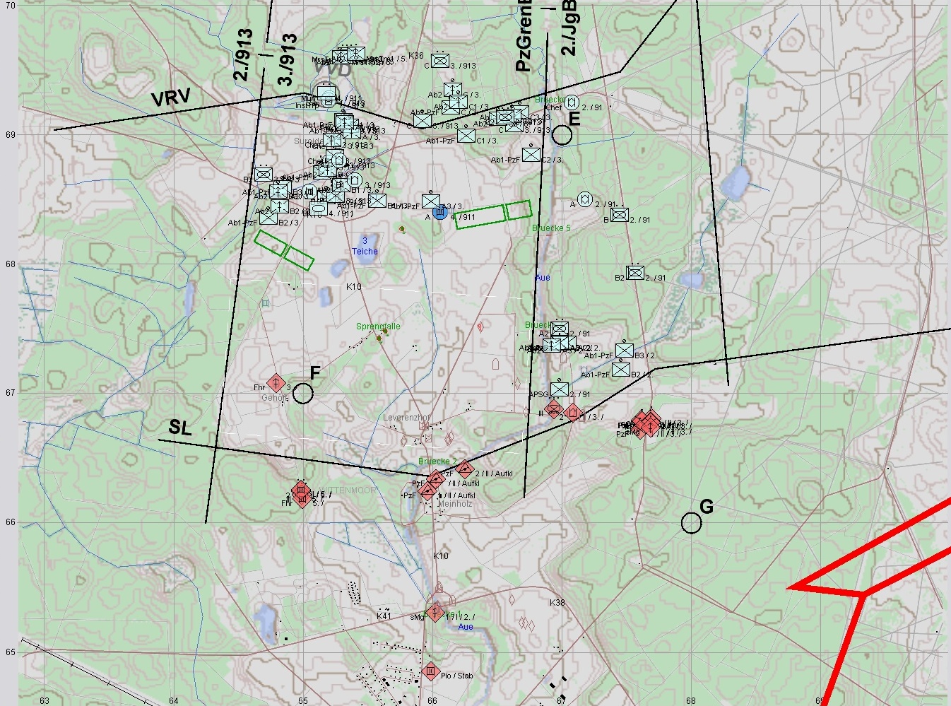 2. Fdl PzKp folgt und bleibt nördlich der Brücken letztlich liegen. A weicht dabei auf Stellungen 2-4 aus:
