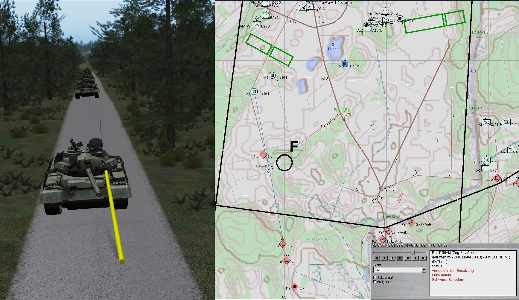 Während im Ostteil der Feind vernichtet wurde, blieb im Westen die Masse einer T-55-Kp in der Waldenge aufgrund bewegungsunfähiger Teile liegen: