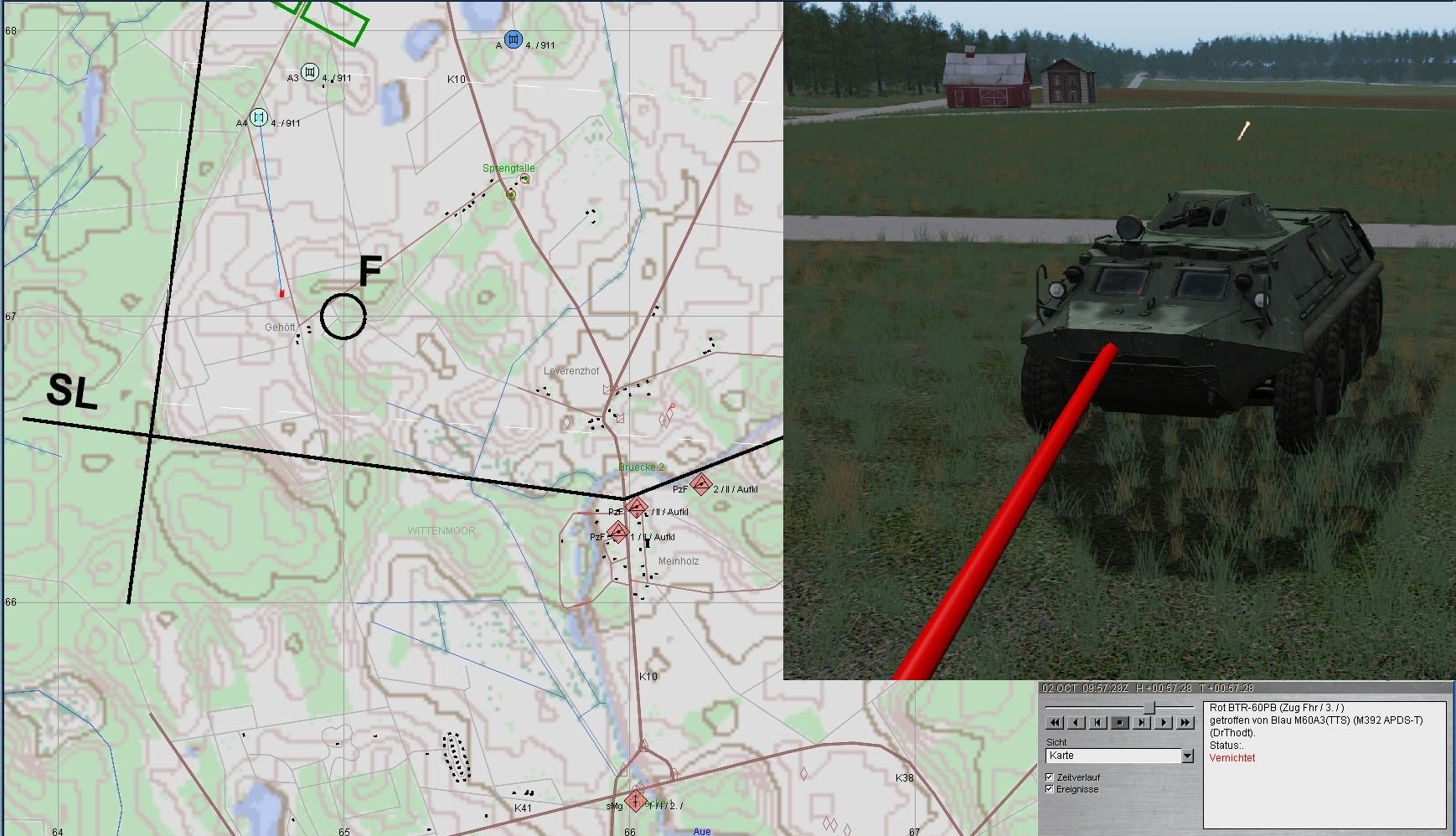 Lage: ROT greift mit Pz (T-55, PT-76) und SPz (BMP/BTR) aus Richtung WIETZENDORF an.