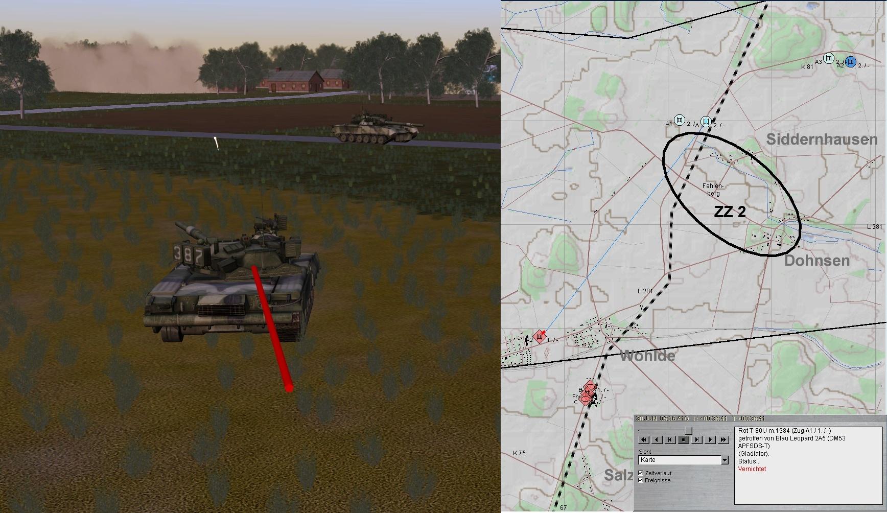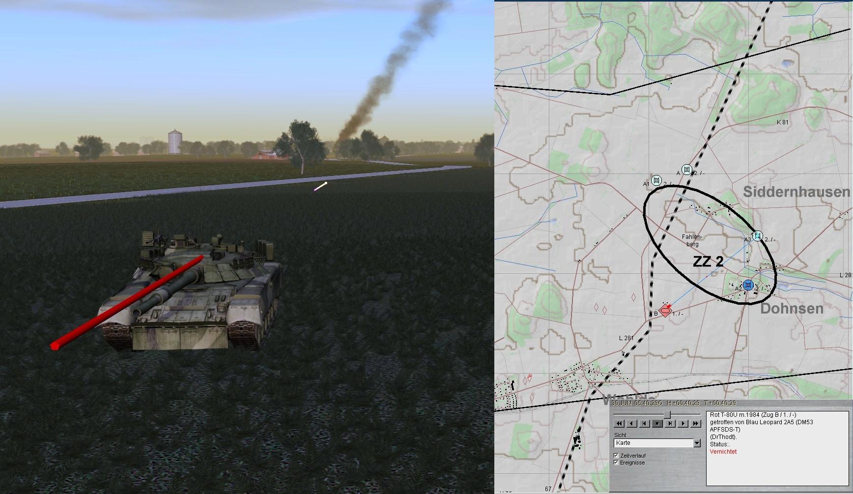 A tritt auf ZZ2 an und trifft auf eine Kp T-80, die aus S in Richtung des westlich anmarschierenden Spitzenzuges zu stoßen droht. A eroffnet den Feuerkampf und vernichtet die fdl PzKp: