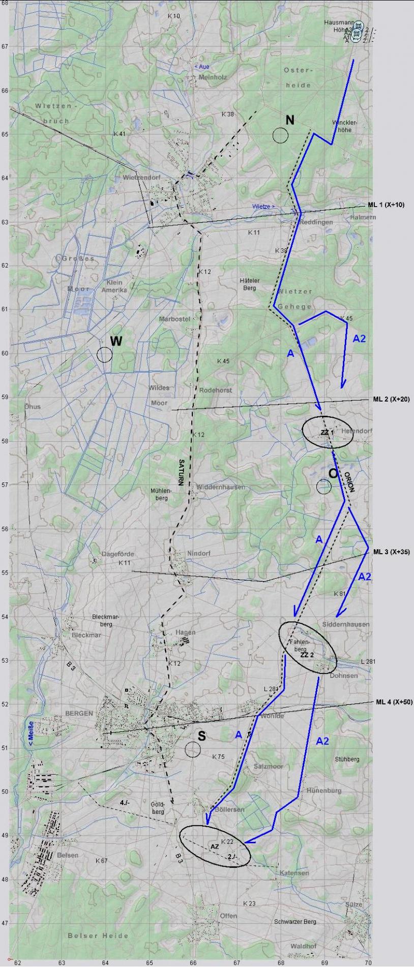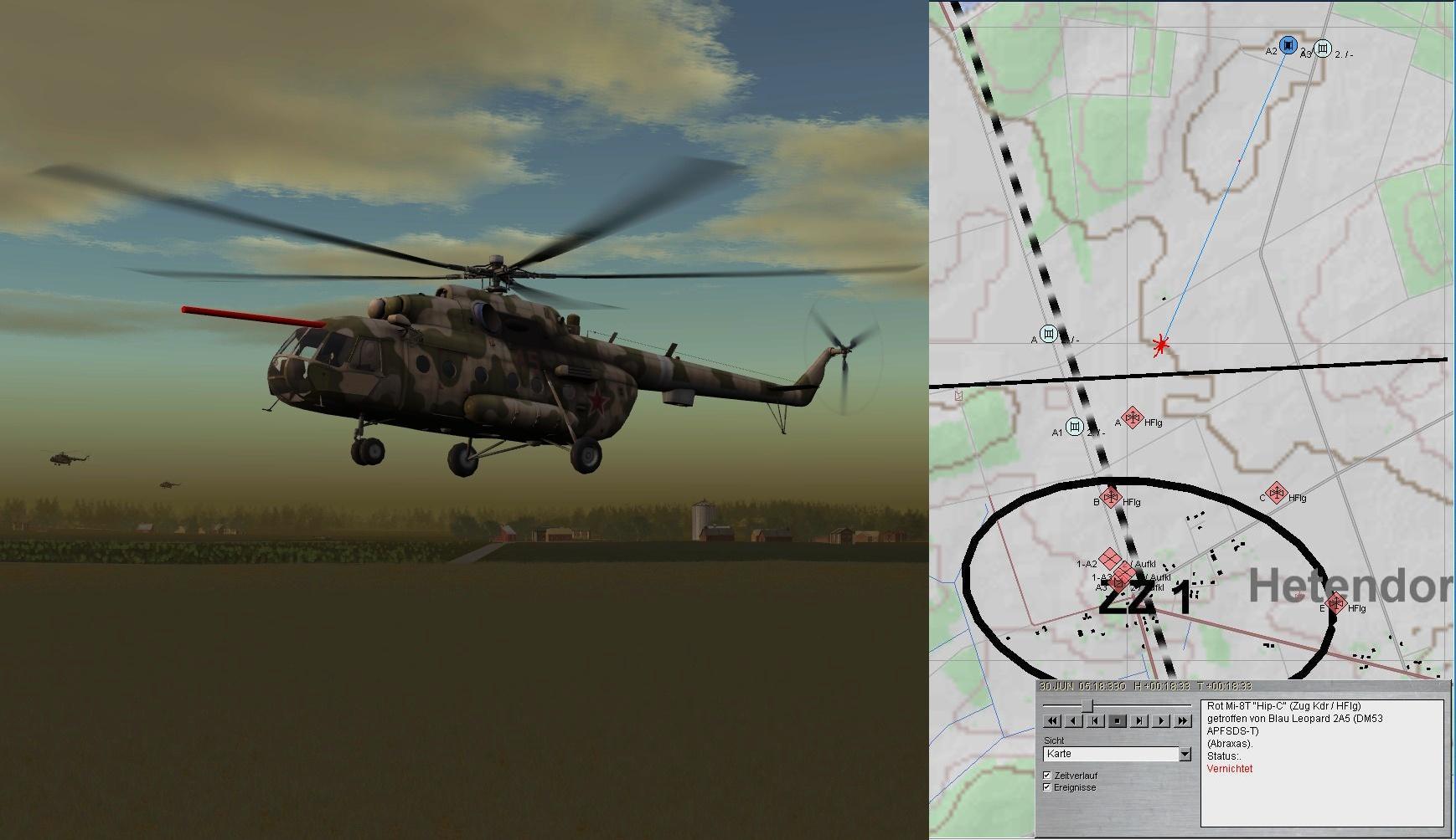 Kurze Zeit später erfolgt hartnördlich von ZZ1 fdl Luftlandung. Alle 6 HIP werden abgeschossen, nur einem gelingt die Landung. Der abgesetzte BMD wird vernichtet und ZZ1 von A genommen: