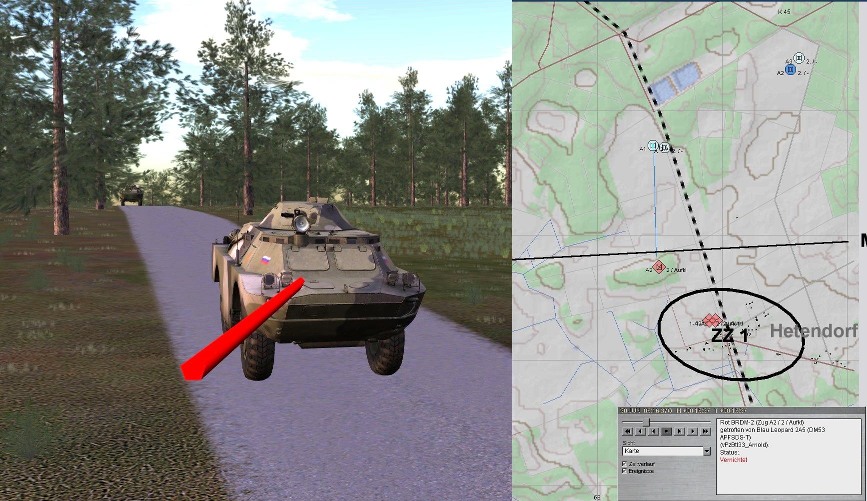 A tritt auf ZZ2 an und trifft auf eine Kp T-80, die aus S in Richtung des westlich anmarschierenden Spitzenzuges zu stoßen droht. A eroffnet den Feuerkampf und vernichtet die fdl PzKp: