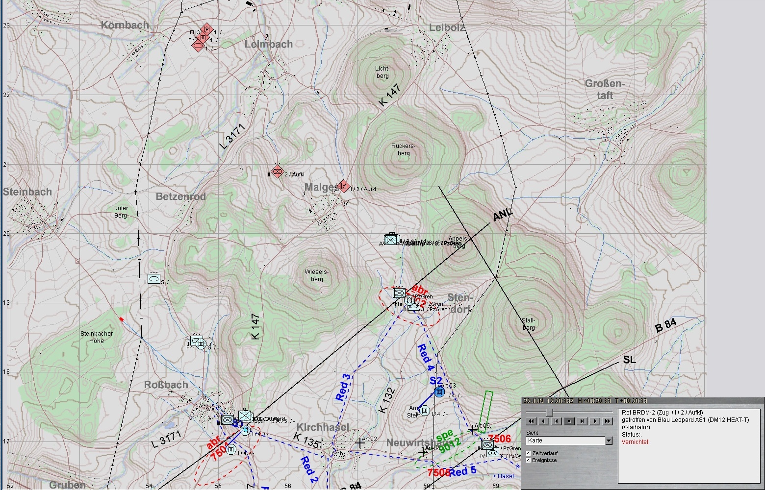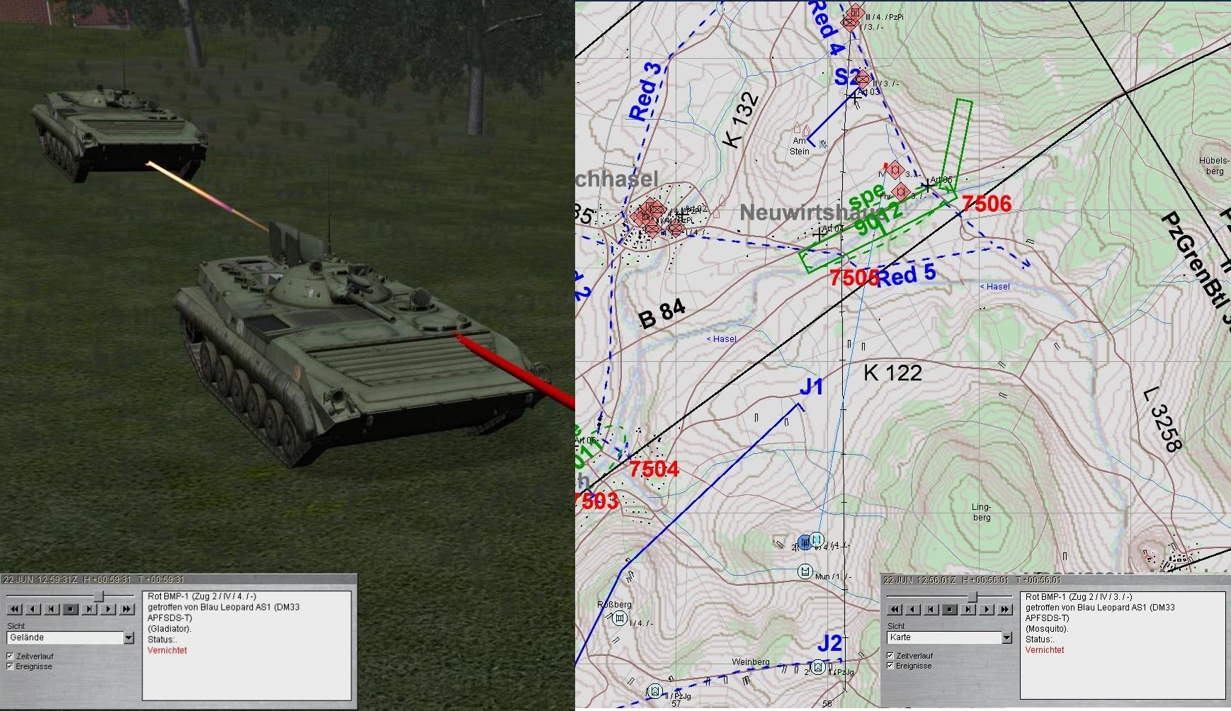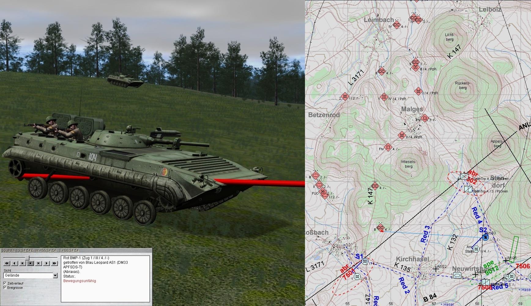 3. In der Mitte greifen BMP an, werden zwar bekämpft, aber A3 wird durch LFK vernichtet. Alle Kräfte A weichen aus: