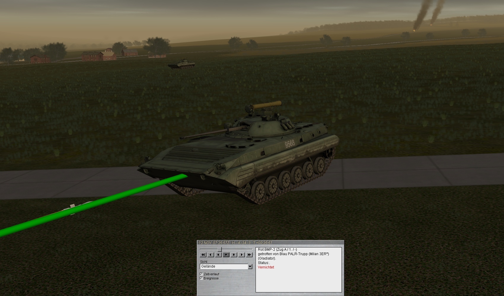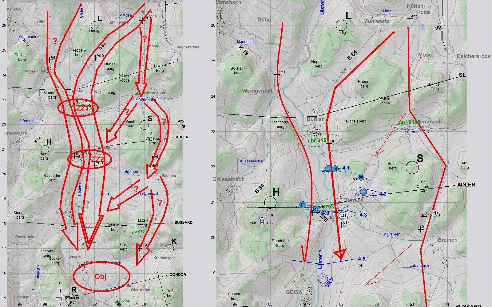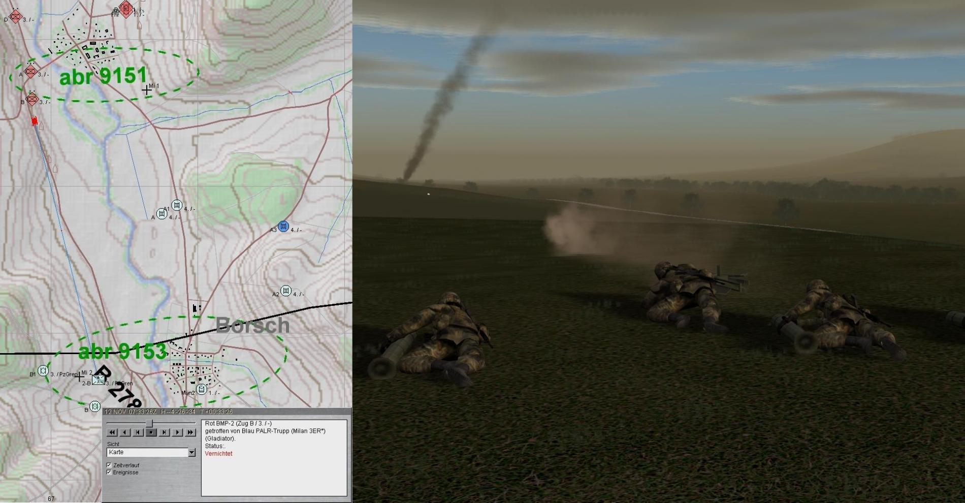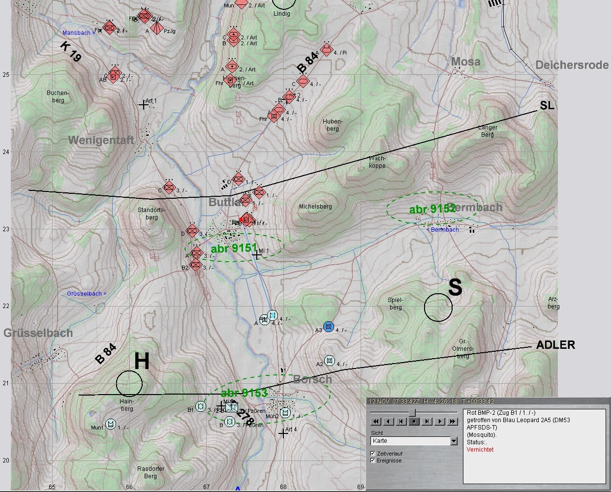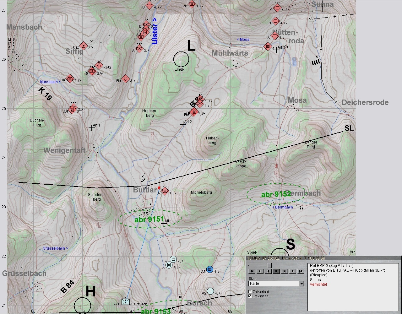 2. ROT führt seine Kräfte heran: 2 BMP-Kp voraus, 1 BMP-Kp westlich ULSTER und 1 PzKp östlich folgen. Auch Artillerie wird herangeführt: