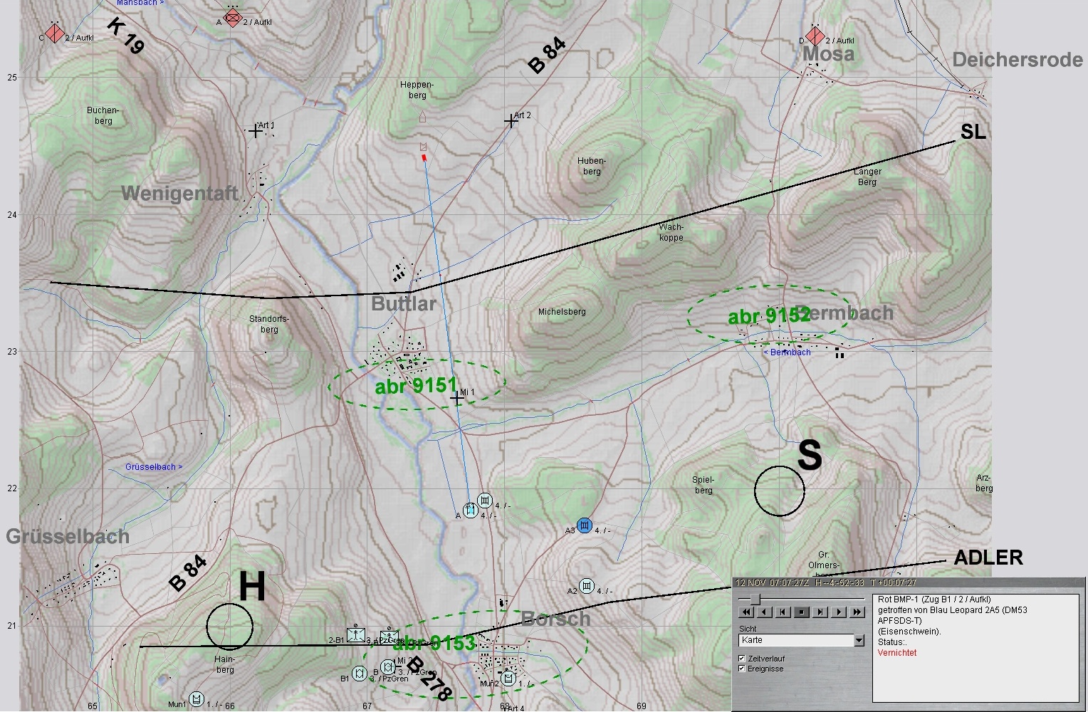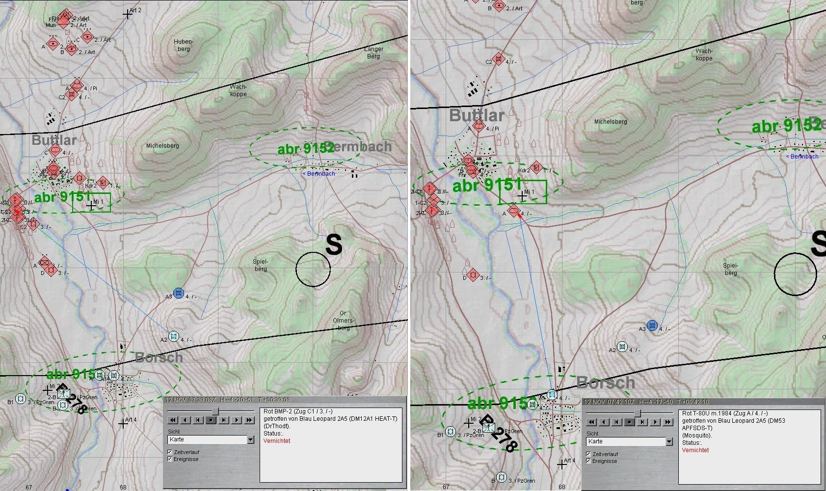 3. VstPzZg weicht mit allen Teilen auf Stellungen beiderseits und N-Rand BORSCH aus und kann ROT am S-Rand BUTTLAR mit vereinten Kräften zum Stehen bringen: