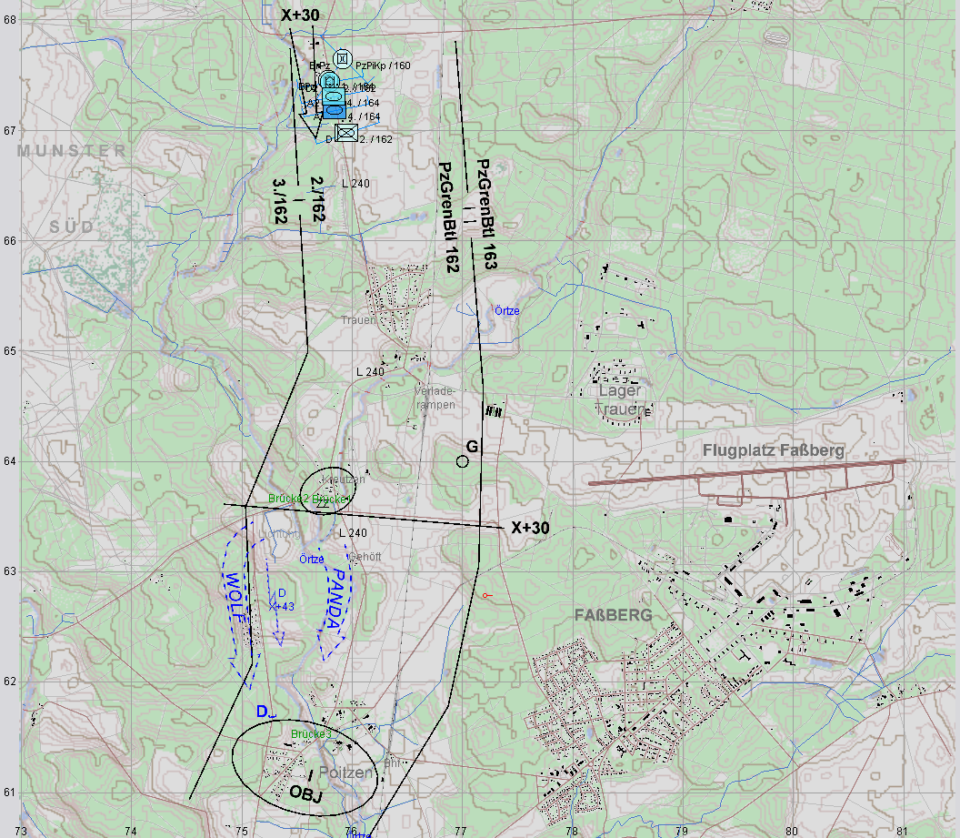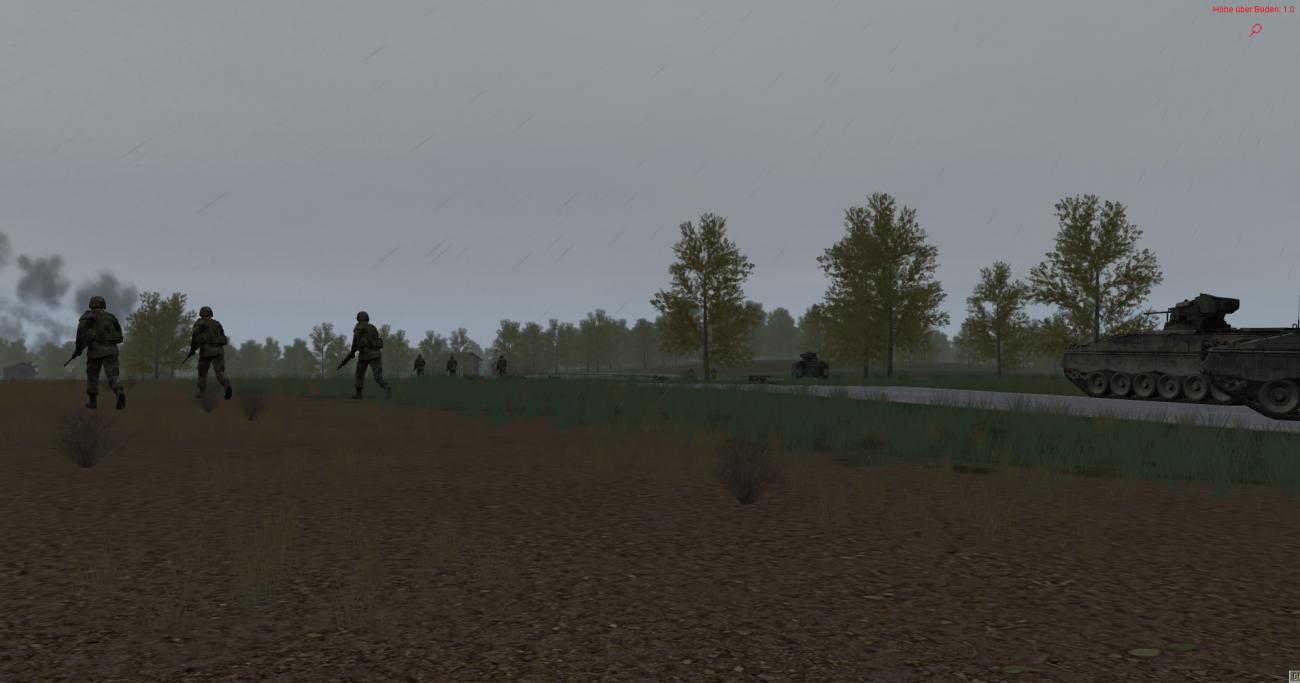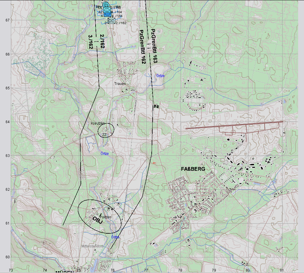 Wir selber treten der PzGrenKp voraus an und überwachen das Objekt der PzGrenKp sowie deren Angriff auf das Objekt (Ortschaft).