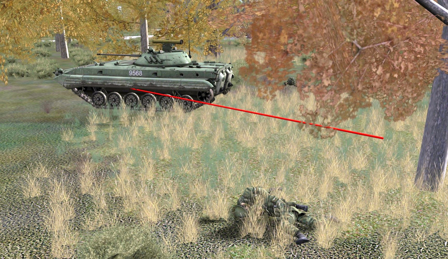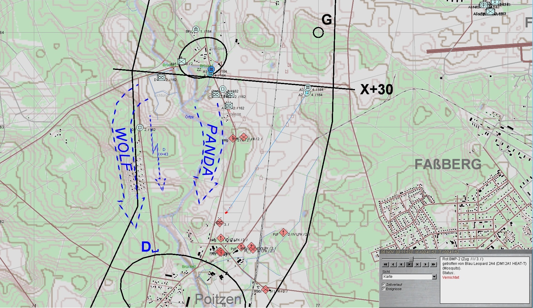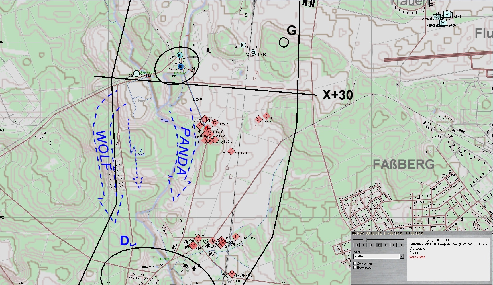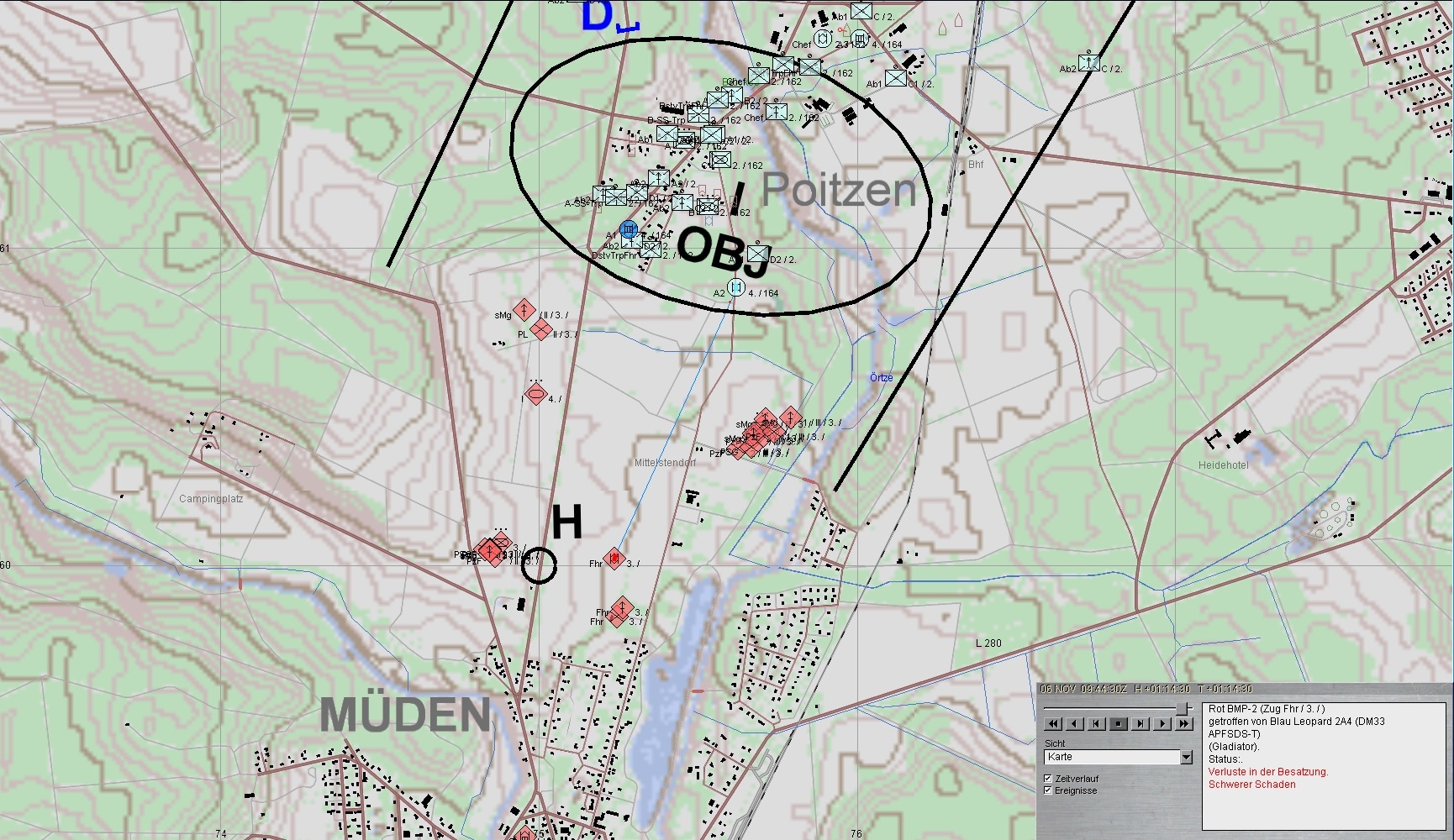 3. Die nachfolgende BMP-Kp wird vom PzZg gestoppt, aber letztlich nicht vollständig vernichtet; abgesessene MotSchtz haben sich festgesetzt: