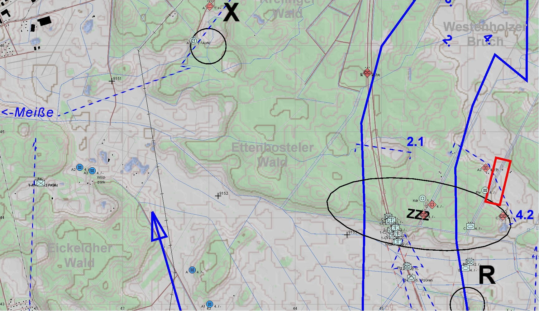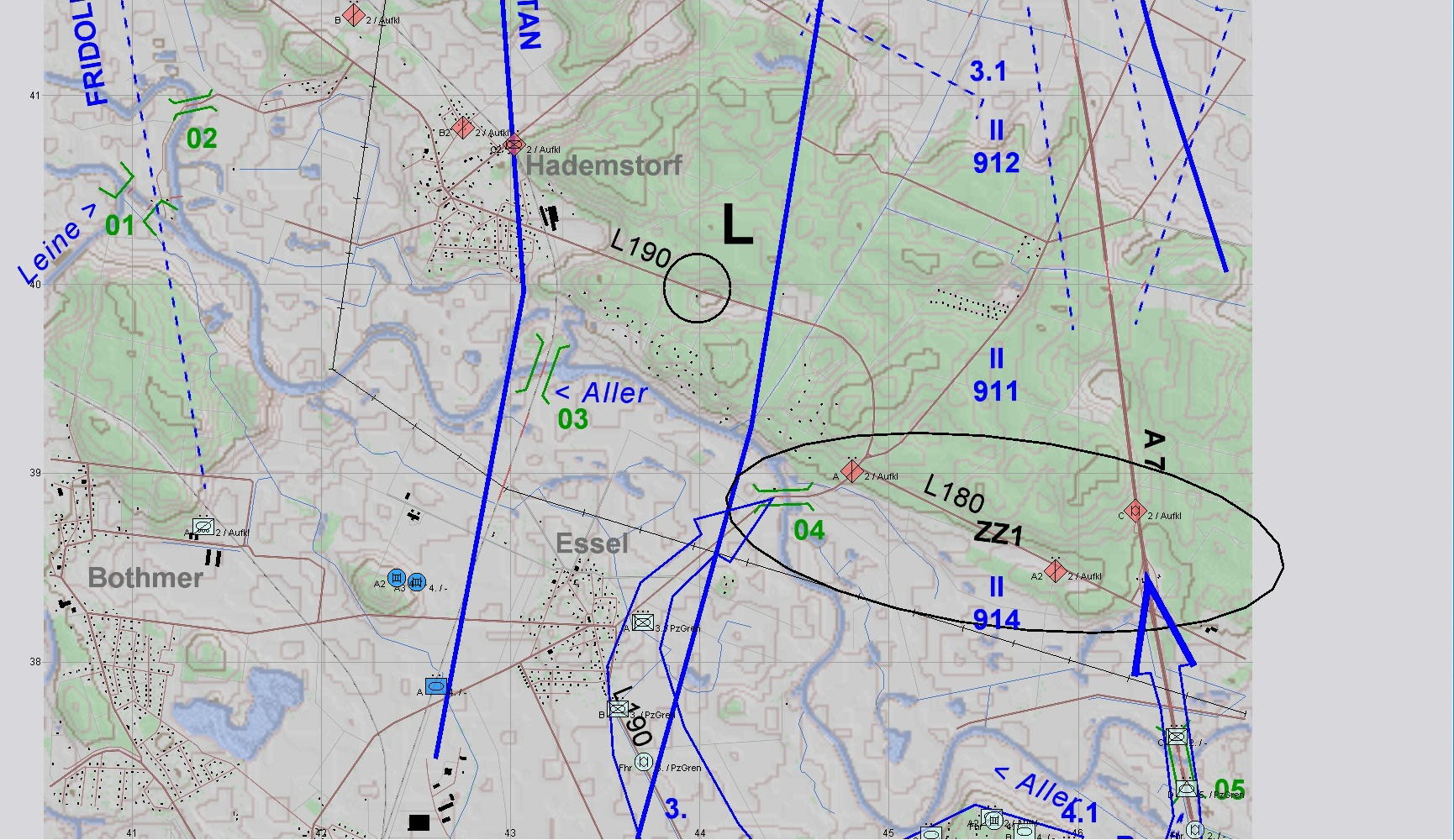 BLAU tritt aus S über ALLER an, um dies zu verhindern. A-PzZg zum Schutz der li Flanke eingesetzt.