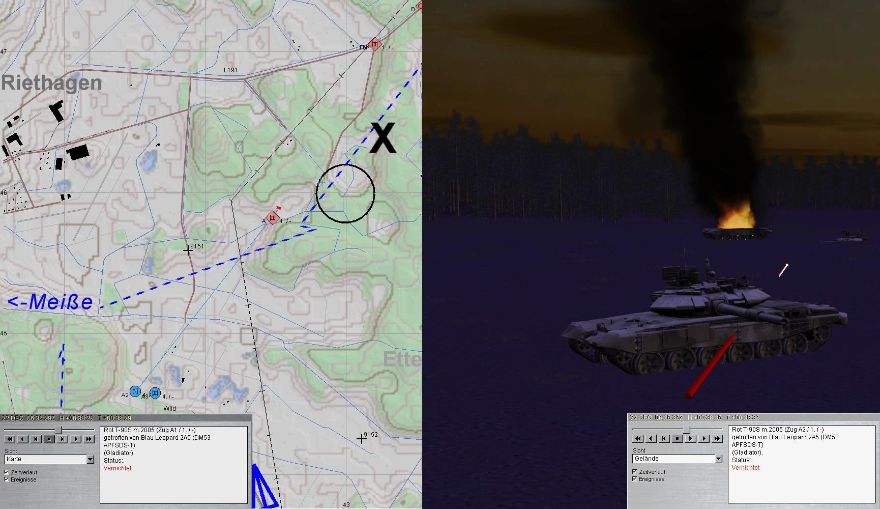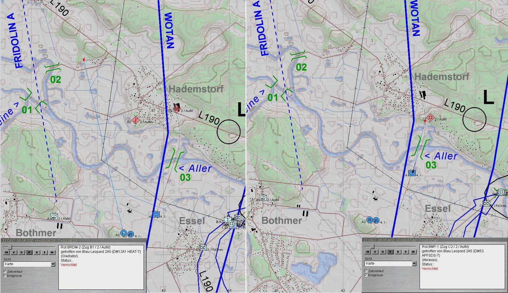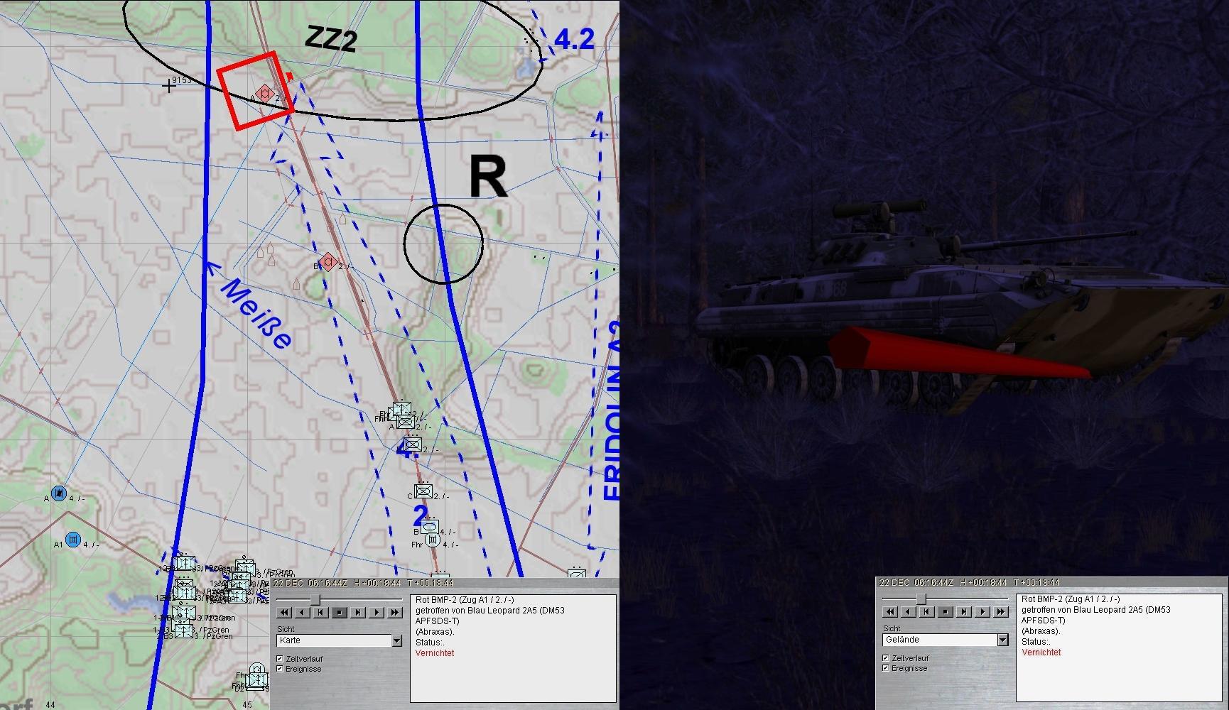 4. Während anschließend A weiterantritt, trifft der SpähTrp FRIDOLIN A auf FdPz und wird vernichtet:
