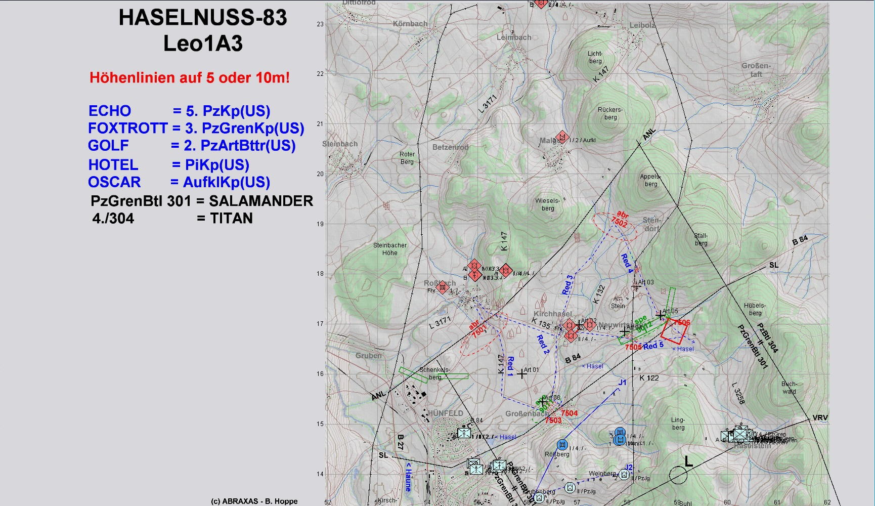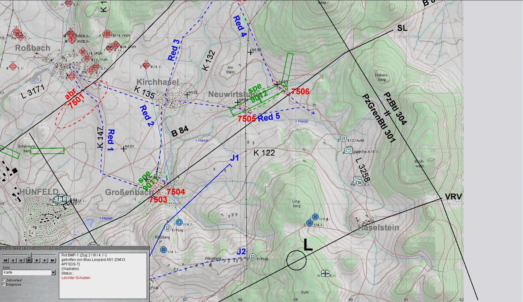 ROT greift mit je 2 PzKp und 2 BMP-Kp mit Schwerpunkt vor A und A1 an: