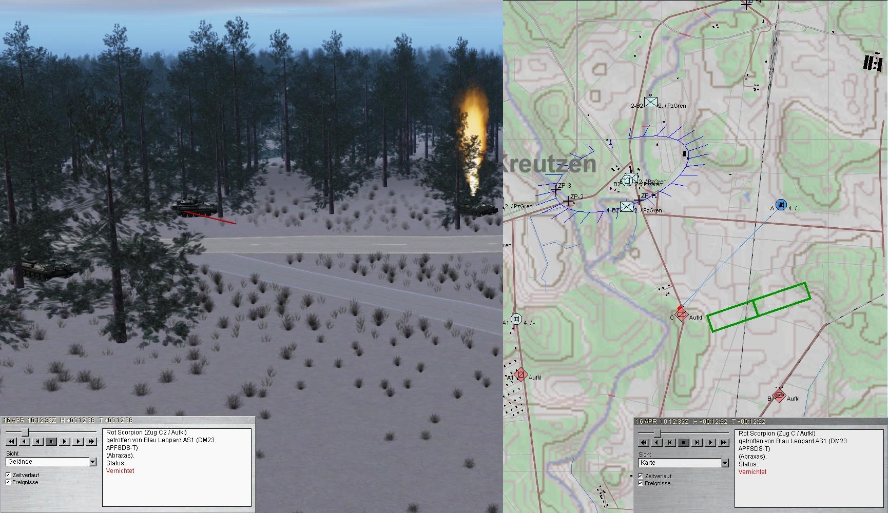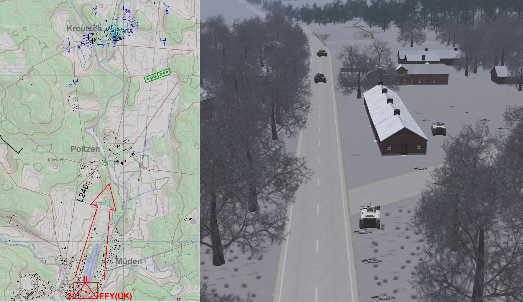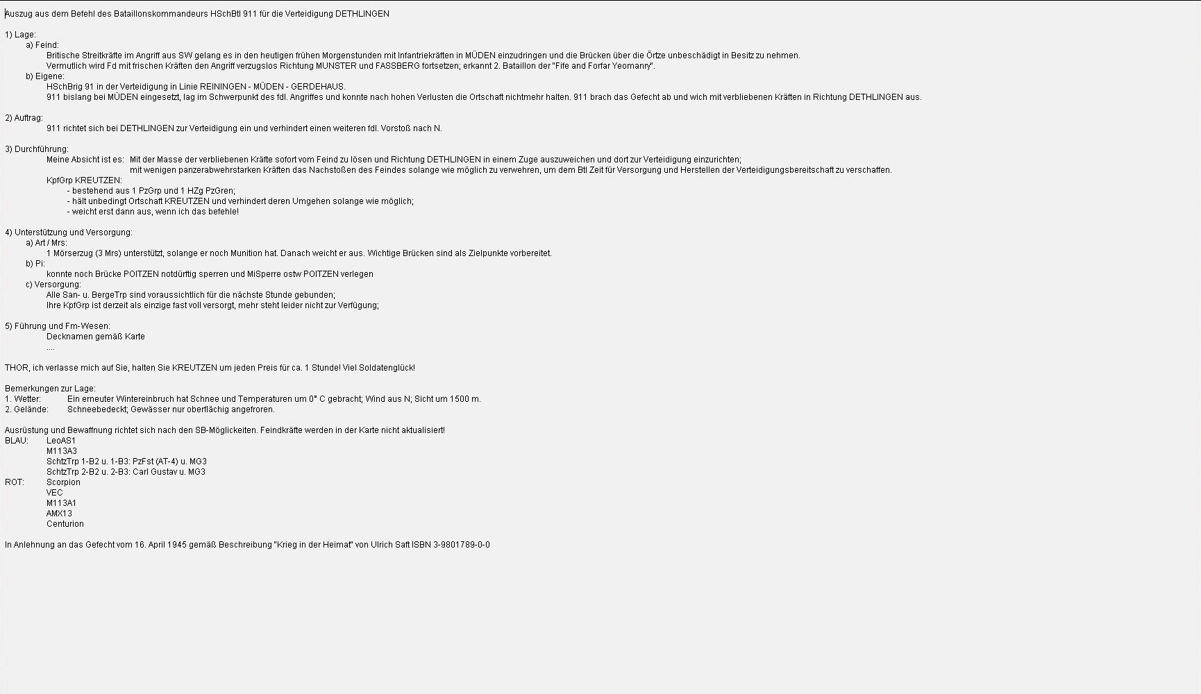 Das Gefecht ist der Versuch ein historisches Gefecht vom 16. April 1945 bei KREUTZEN gegen das 2. Btl der "Fife and Fortar Yeomanry" UK mit den Möglichkeiten von SB darzustellen.